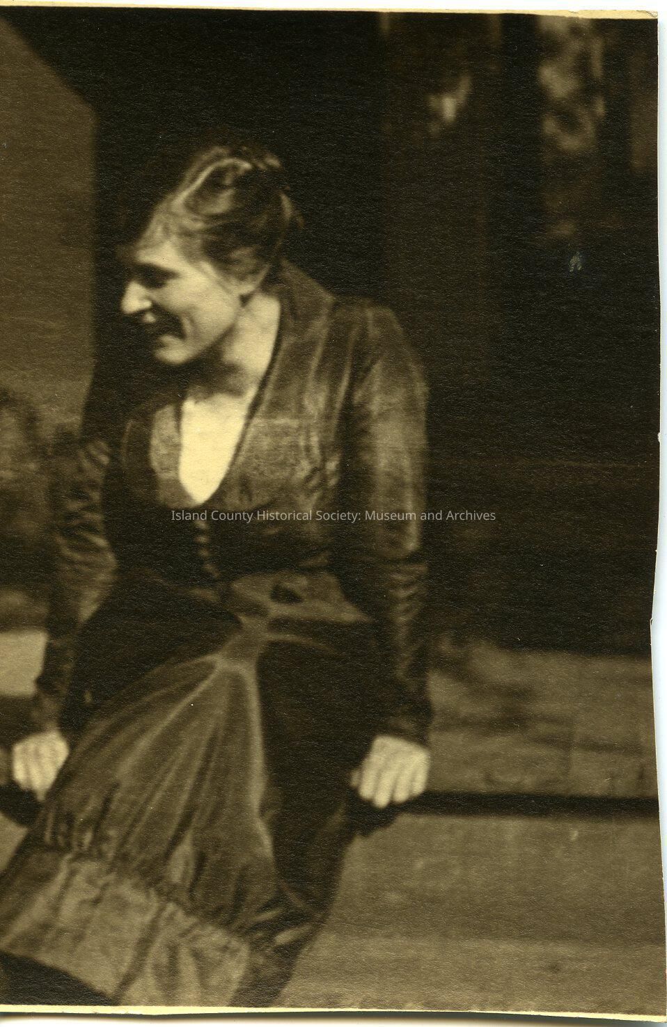 Black & white photo of woman in a long, dark, satin dress. Her dark hair is pinned up. She is sitting on a porch. No description or date.