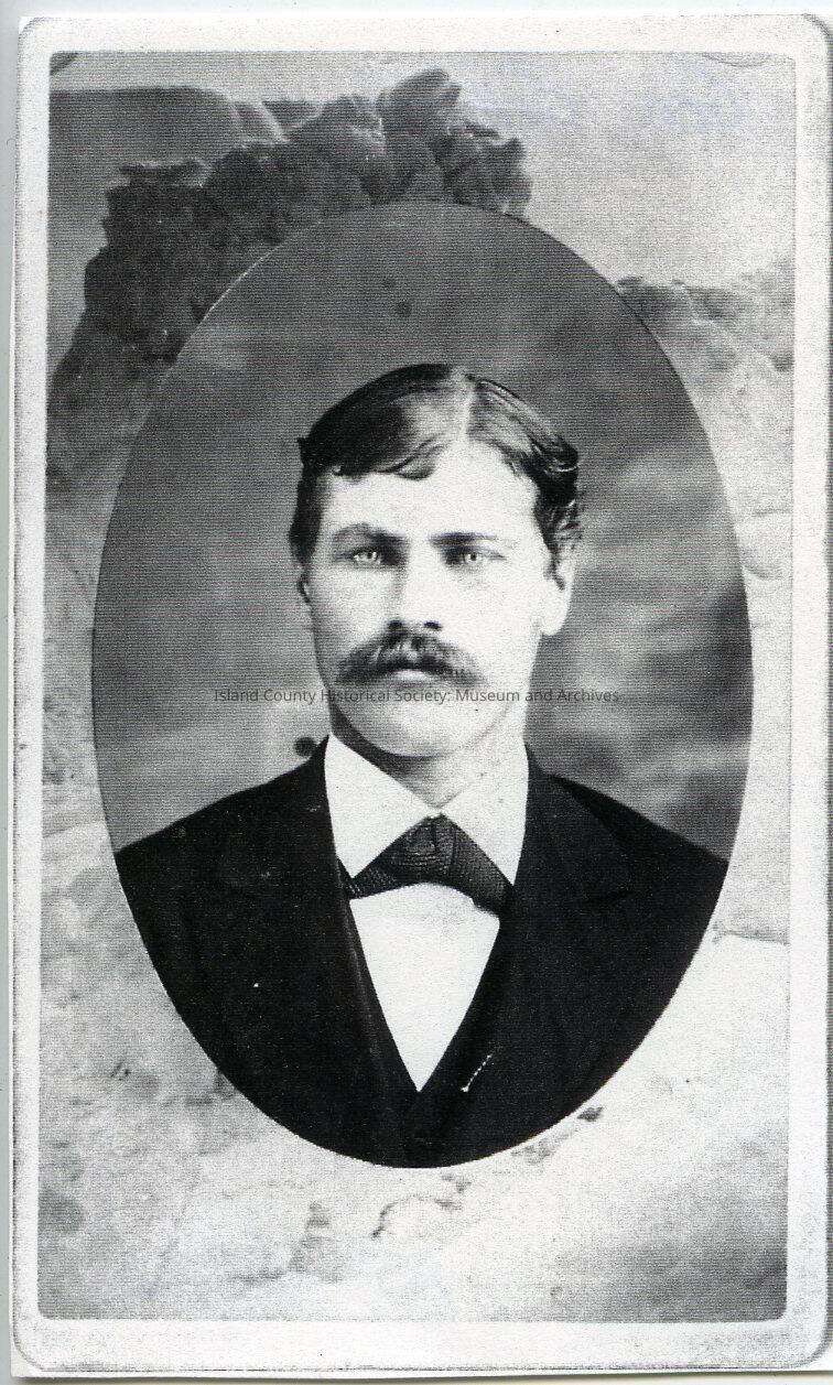 Black & white portrait photocopy of George Grasser as a young man with brown hair and a mustache. He is wearing a suit jacket, white shirt and tie. This is a photocopy of the original which was an oval picture in a rectangular patterned frame. No date.