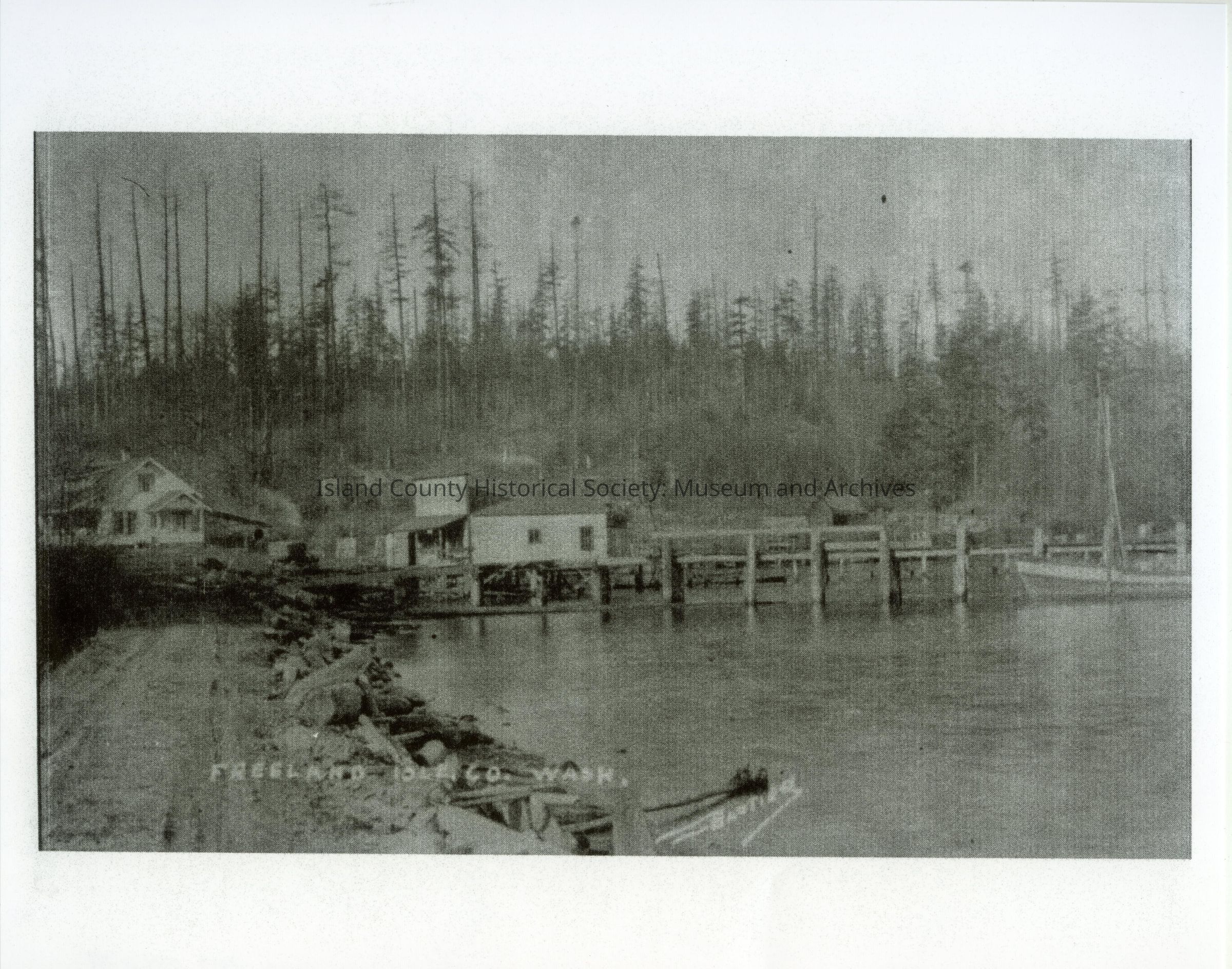 Photo of Freeland from the dirt road looking at two buildings. The building on the left looks more like a house - windows, porch, central chimney. The one on the right looks like a store with a false front and porch. A pier is in the center of the photo and a small sailboat is tied at the right end. Driftwood on the beach. Other buildings in the distance. Trees on the hill but thinned out. Caption: Freeland Isle. Co. Wash.