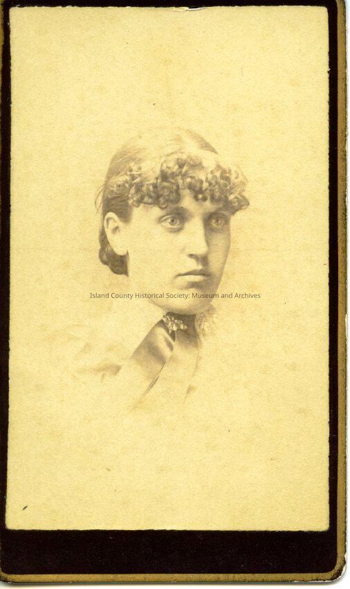 Portrait of an unidentified woman seen from the shoulders up. Her hair is in a unique style with ringlets in the front.