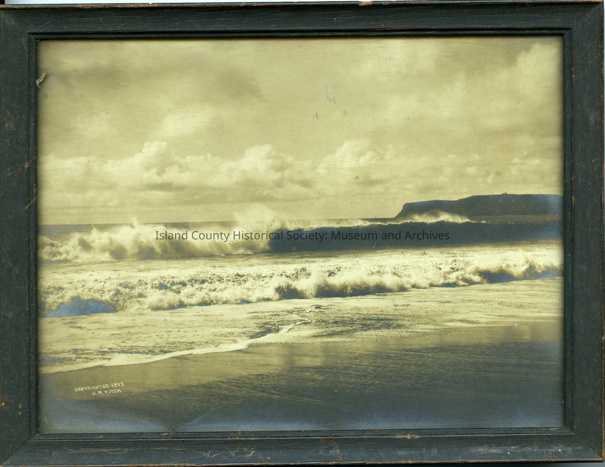 Black & white photo mounted in a black wood frame of a shoreline taken from a beach. There is a high bluff in the background. Printed on the bottom left of the photo is, "Copyrighted 1899 H. R. Fitch".