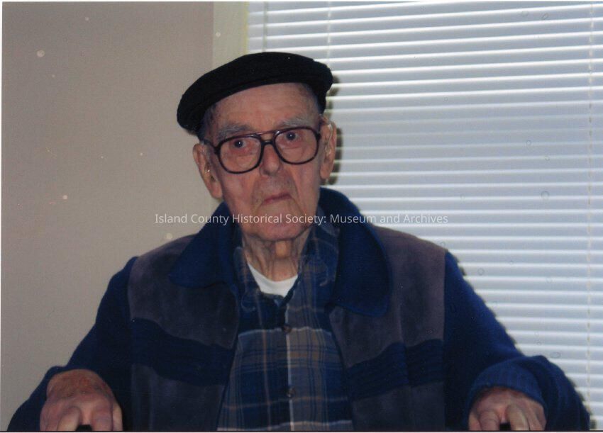 Color photograph of a senior gentlemen sitting with front of window with blinds wearing a beret and glasses. John McLeod. John grew up on Whidbey and worked at the Dog House in Langley. Grew up on Anthes, one of nine children.