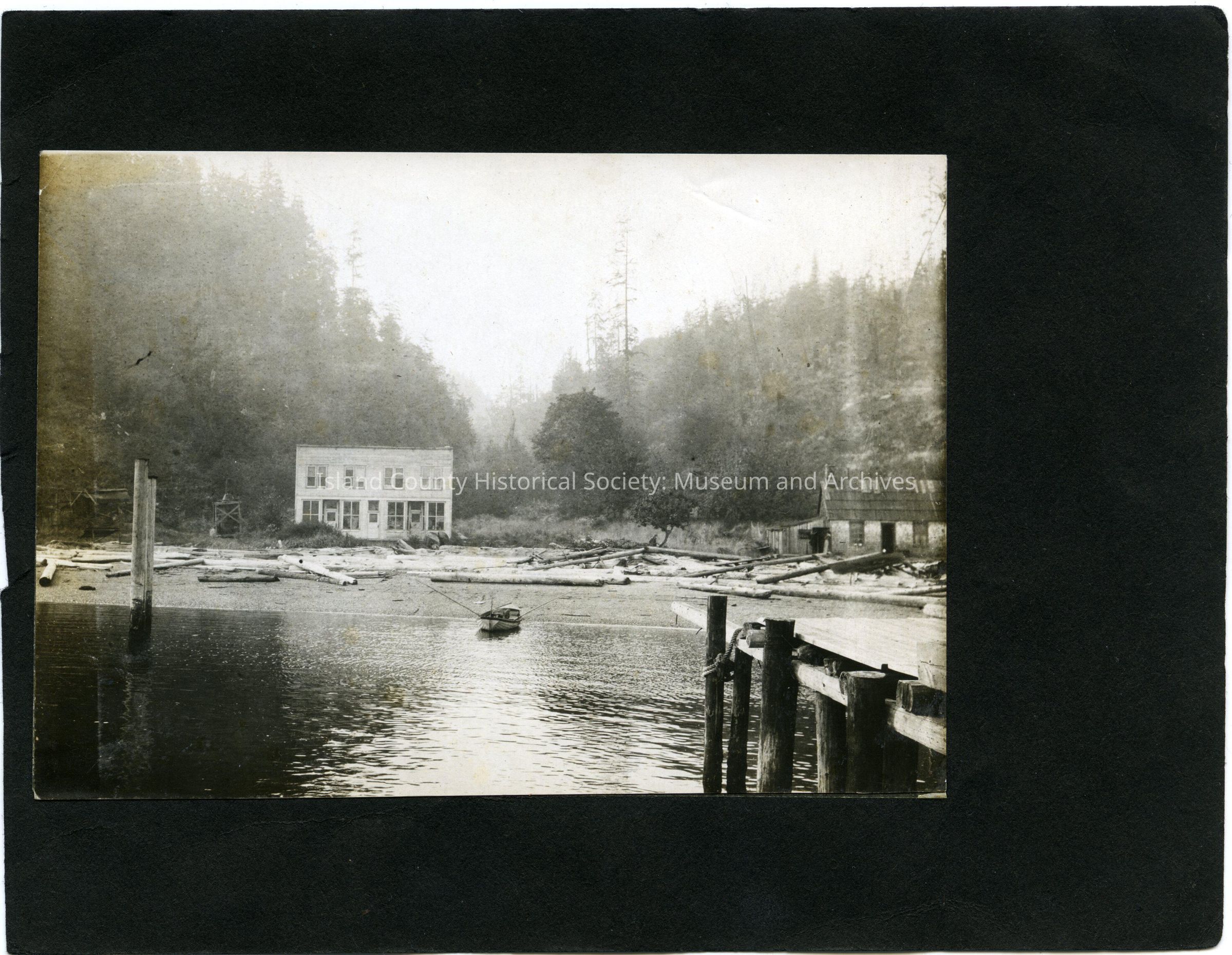 Photo of Glendale, probably from the wharf or boat near the end of the wharf. The building is two story with large windows on the lower floor and three doors. A dilapidated house or warehouse is on the right with a shed on the left side. A small rowboat is just beached on the shore. Driftwood. Trees on the hill.