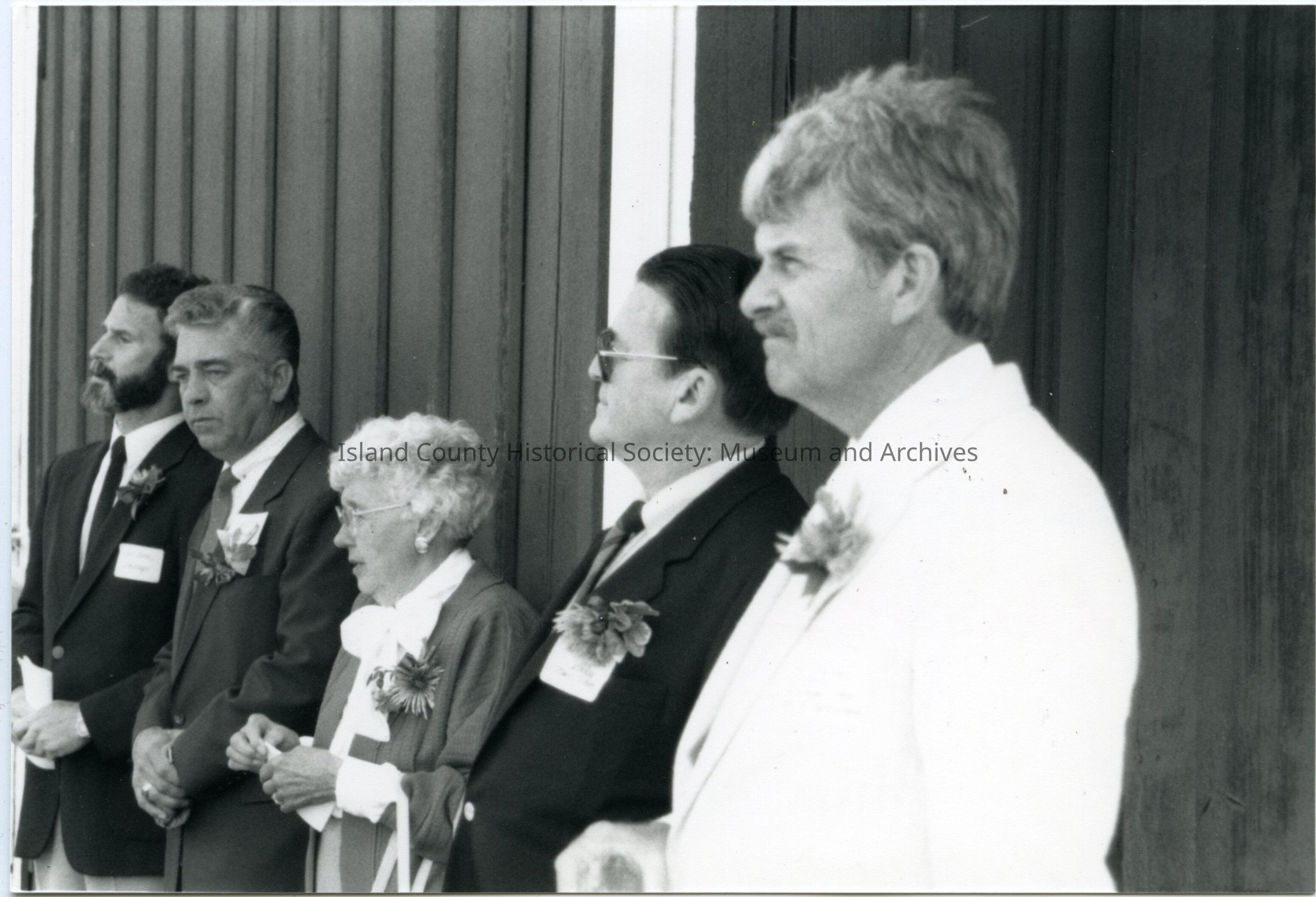 Photo of four men and a woman standing in a row in front of a building. They are all facing the left and all have name tags and corsages/lapel flowers. On the back: Bob Betz, Jack Kelly, Dean Bratsberg, Wallie Funk, Allen Pettibone. Whidbey Winery Opening.