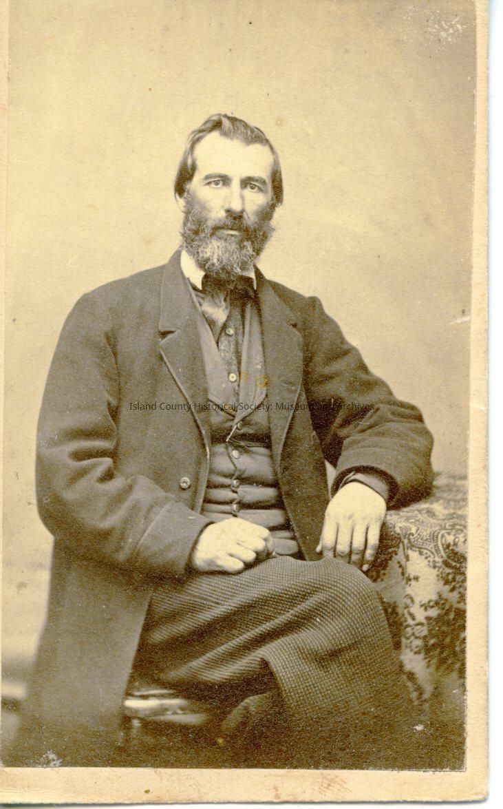 Portrait of an unidentified man wearing a suit and tie and doning a large beard. A three-cent stamp is on the back.