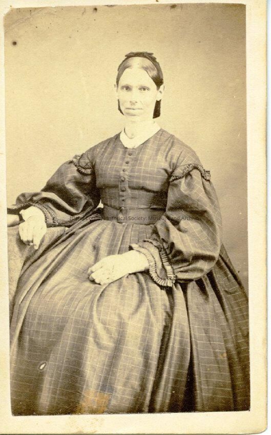 Portrait of an unidentified woman seated in a very large dress. A two-cent stamp is on the back.