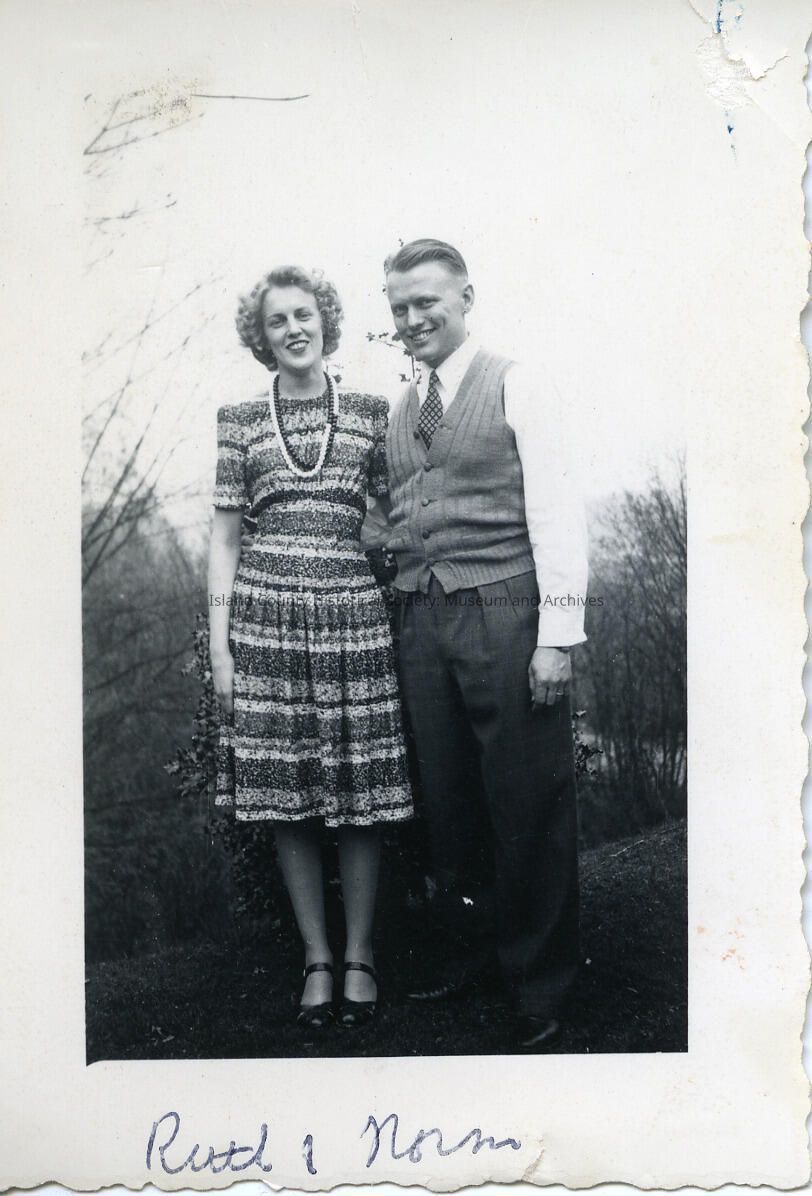 Black and white photograph of a young couple standing on a lawn in front of bushes. Bottom of photograph contains the names of Ruth and Norm Jacobson on their honeymoon.