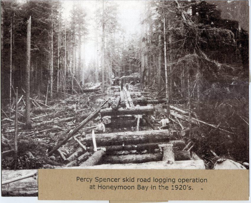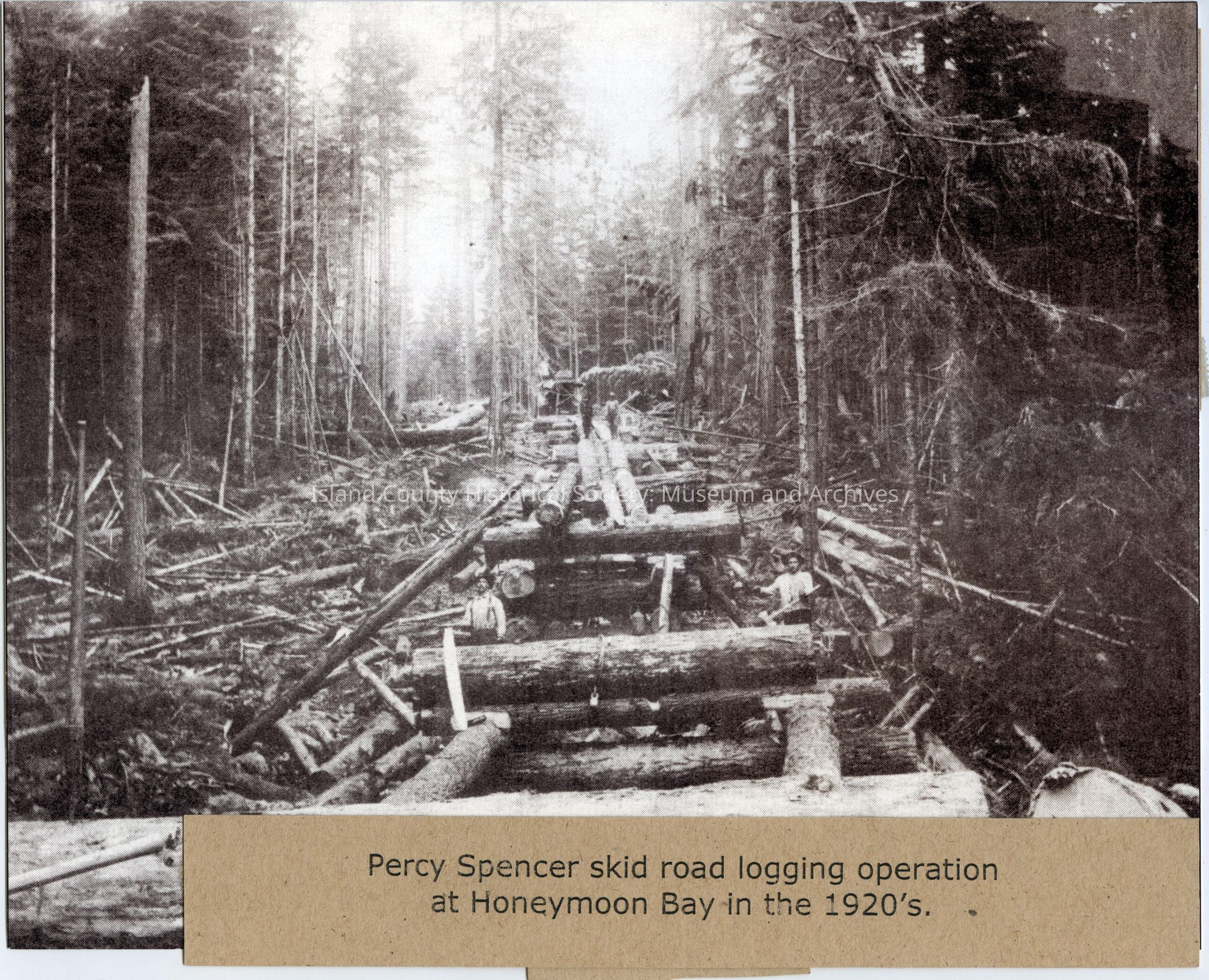From a piece of paper attached to the photo: Percy Spencer skid road logging operation at Honeymoon Bay in the 1920s.