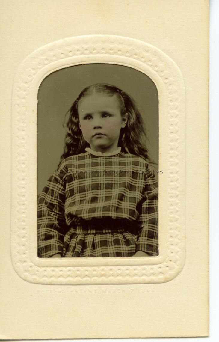 Portrait of Nettie L. Cobb wearing a plaid dress. Her cheeks have been colored pink. She is pictured at 5 years old, Nov 10th 1873.
