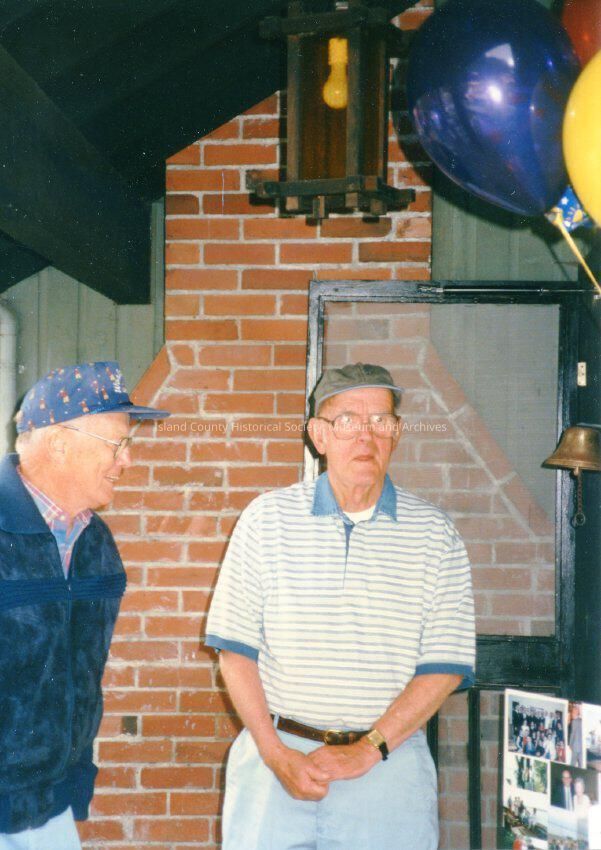 Color photograph of two men in front of the outside of a brick fireplace. Ballons showing to side. They are dressed casually, wearing baseball style caps. Norman Jacobson and John McLeod.