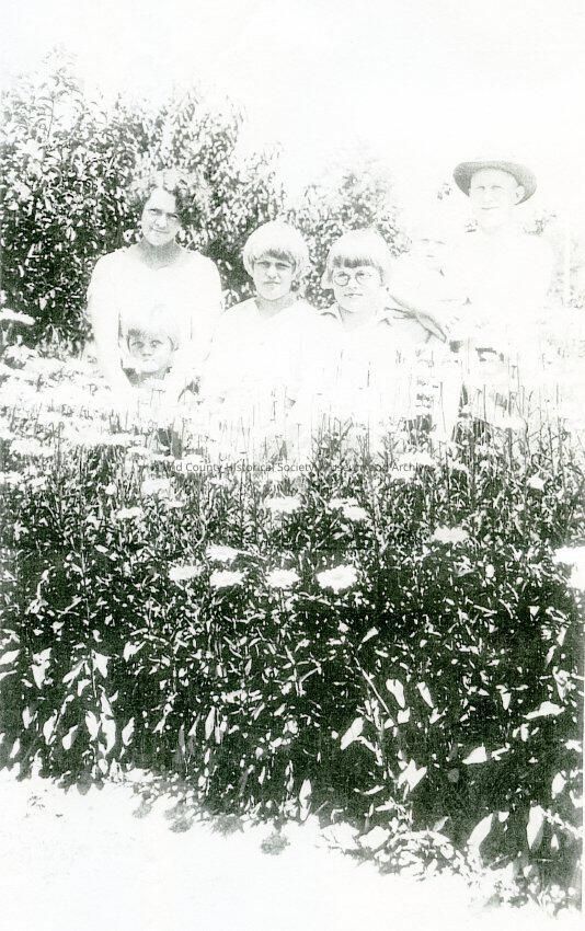 Black and white photograph of a man and a woman with two possibly early teen children, one younger child, and the man holding a baby. In front of the individuals are flowers up to the youngest childs chin. They are standing in front of tall hedges. Grandma Elizabeth Bell on the left, Ruth Bell, Winifred (Winnie) Bell, and assuming Grandpa Dave Bell in the hat). This was likely taken in Grandma Bell's garden.