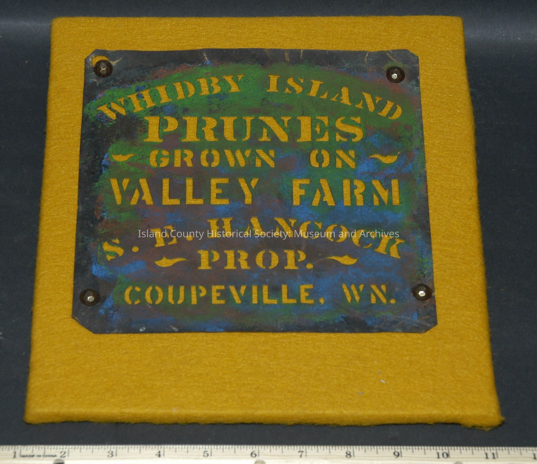 Stencil used on end of crates of prunes shipped by Samuel E. Hancock 1894-1910 Whidbey Island prunes grown on Valley Farm SE Hancock Prop - Coupeville, WA -