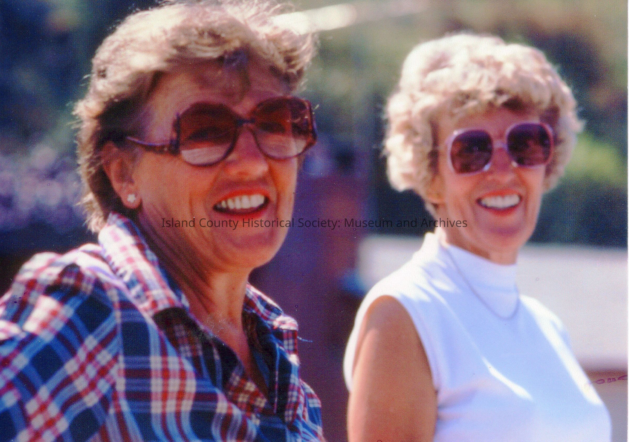 Color photograph of two women wearing sun glasses. One has a blue plaid blouse, the other a white sleeveless blouse. Virginia "Ginger" Bell Erickson in the plaid, and Ruth Bell Jacobson on the right.
