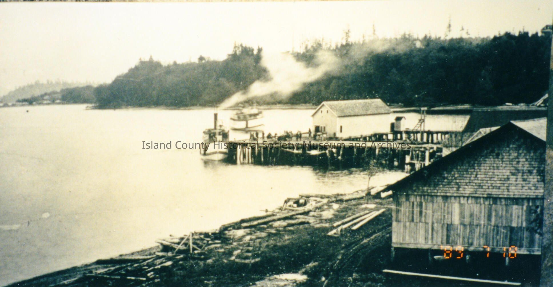 Black and white photograph of a dock with a building on the dock. A ship by the dock giving off smoke from its smoke stack. Another boat is out beyond the dock and ship. In the foreground is an additional building on land with logs between it and the water. On the foreground of the photo are the numbers "'89 7 10."