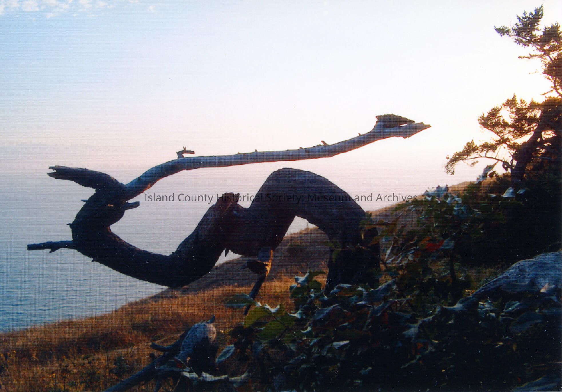 Color photograph of a tree trunk bent by the wind into an interesting shape. There are no branches or leaves on the tree. The tree is on the side of a hill with water in the background.