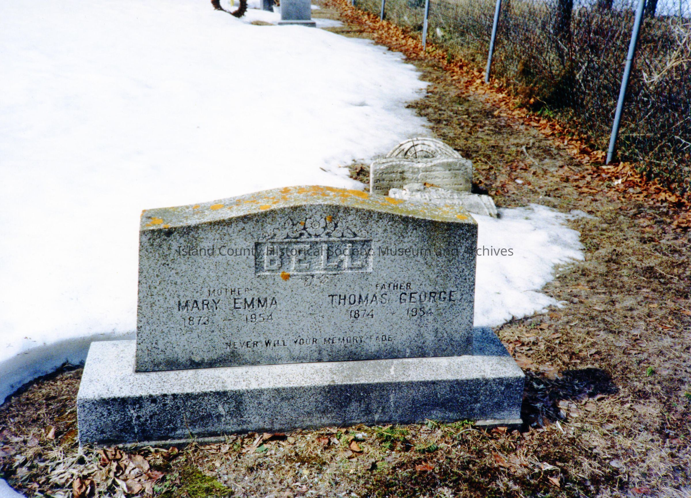 Color photograph of tombstone for Mary Emma Bell, 1873 - 1954, and Thomas George Bell, 1874 - 1954.