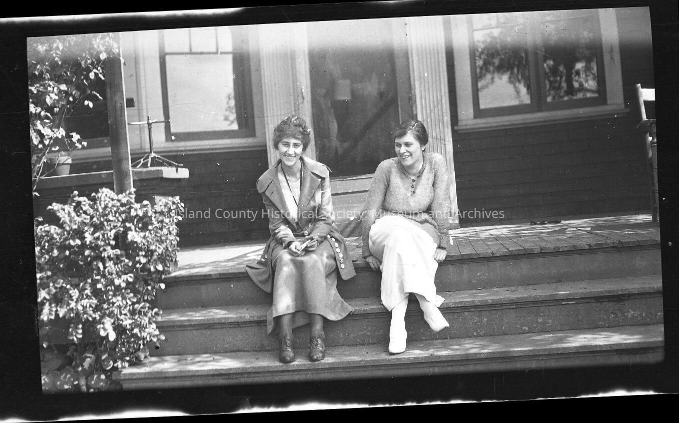 Negative of two smiling women sitting on the front steps of an old house. Their dark hair is pinned up. They are wearing ankle-length skirts, ankle-high shoes, and long sleeve jacket/blouses.