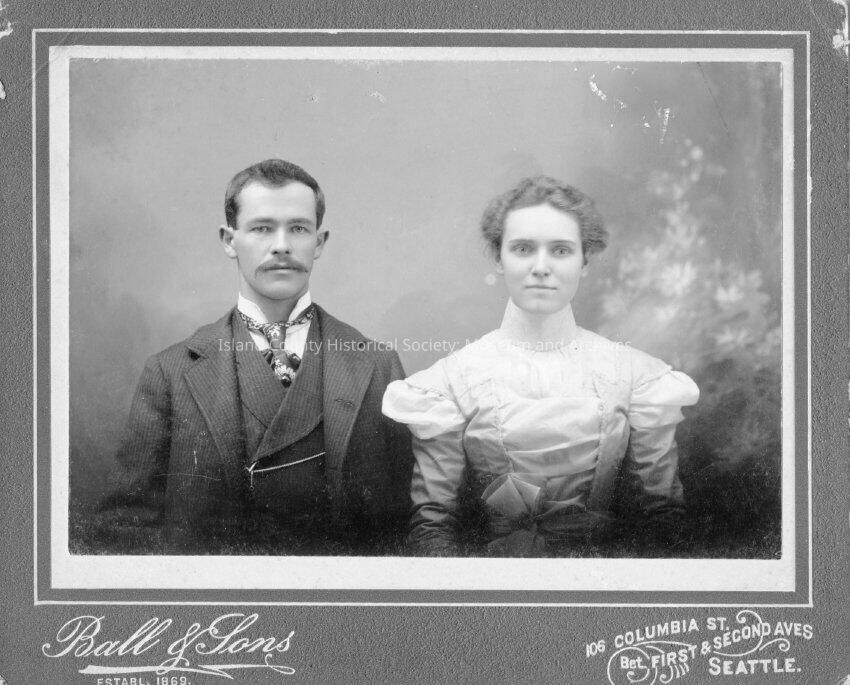 Portrait of Mr. and Mrs. Arnold Allenson. Mr. Allenson is wearing suit and tie and Mrs. Allenson is wearing a white dress with a stiff colar.