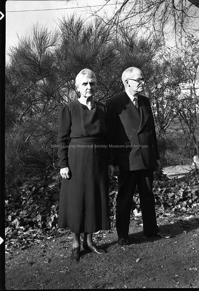Negative of an elderly, gray-haired woman & man standing in a garden. The woman is wearing a dark, long-sleeved bouse & mid-calf skirt with ankle-high laced shoes. The man is balding and wearing glasses. He is dressed in a dark suit & tie.