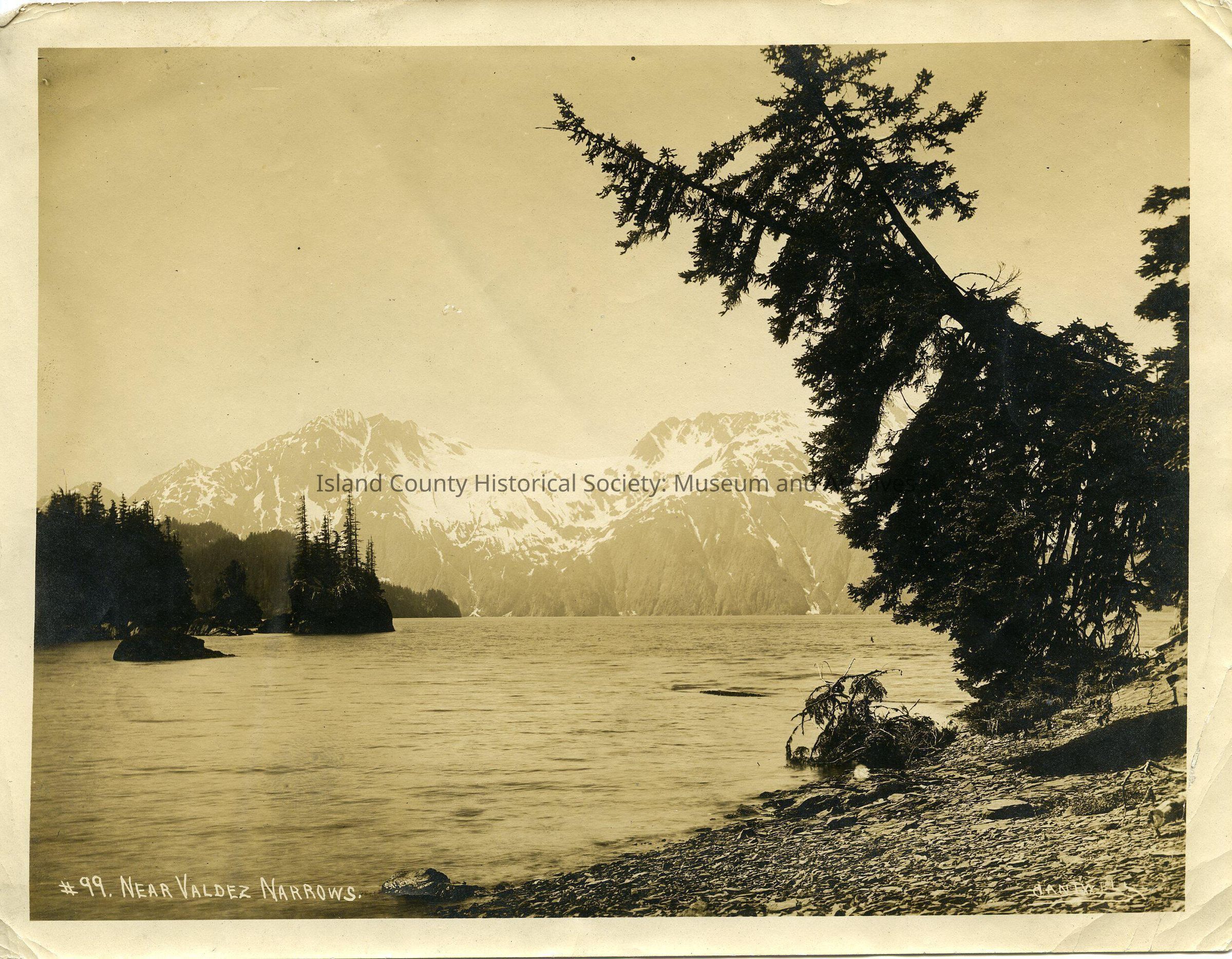 Black & white photo of the Valdez Narrows, Alaska. The photo has a rocky beach with leaning evergreen trees in the foreground, water and the snow-covered mountains in the background. Printed in the lower left corner, "#99. Near Valdez Narrows."Made/Created