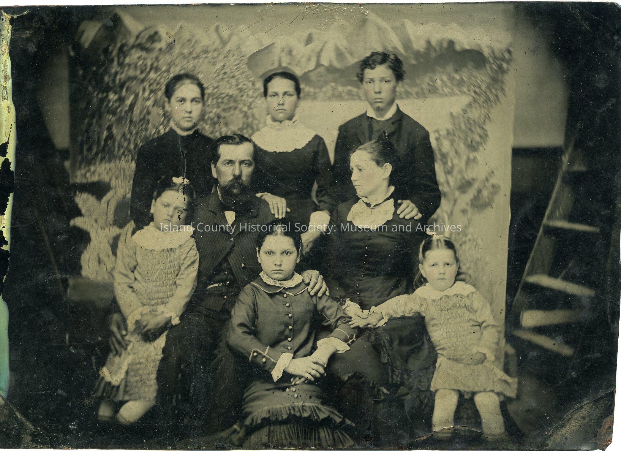 Tintype photo of a family portrait taken in the 1800s. The father and mother are seated in the middle, the two oldest girls and the son are standing behind the parents. The three youngest girls are seated in front of the parents. The mother and girls are wearing long dresses with lace collars. The father and son are wearing 3-piece suits. The backdrop for the photo is a sheet with a scene of mountains and water painted on it. Scratched onto the back of the potograph, "The Ward family".
