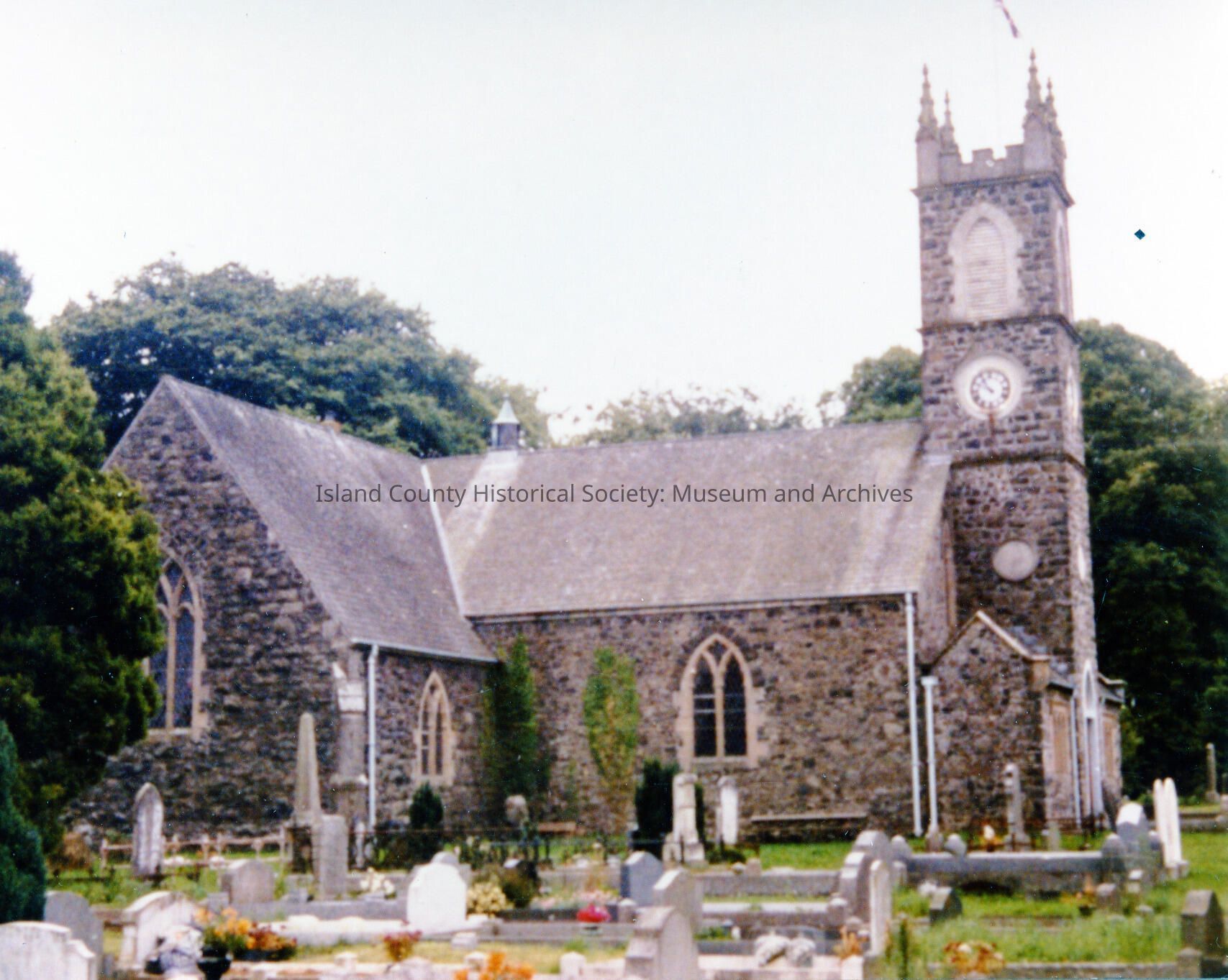 Color photograph of a stone church with a steeple containing a clock. In the foreground is the church's cemetary. Steeple of church has four pinnacles.