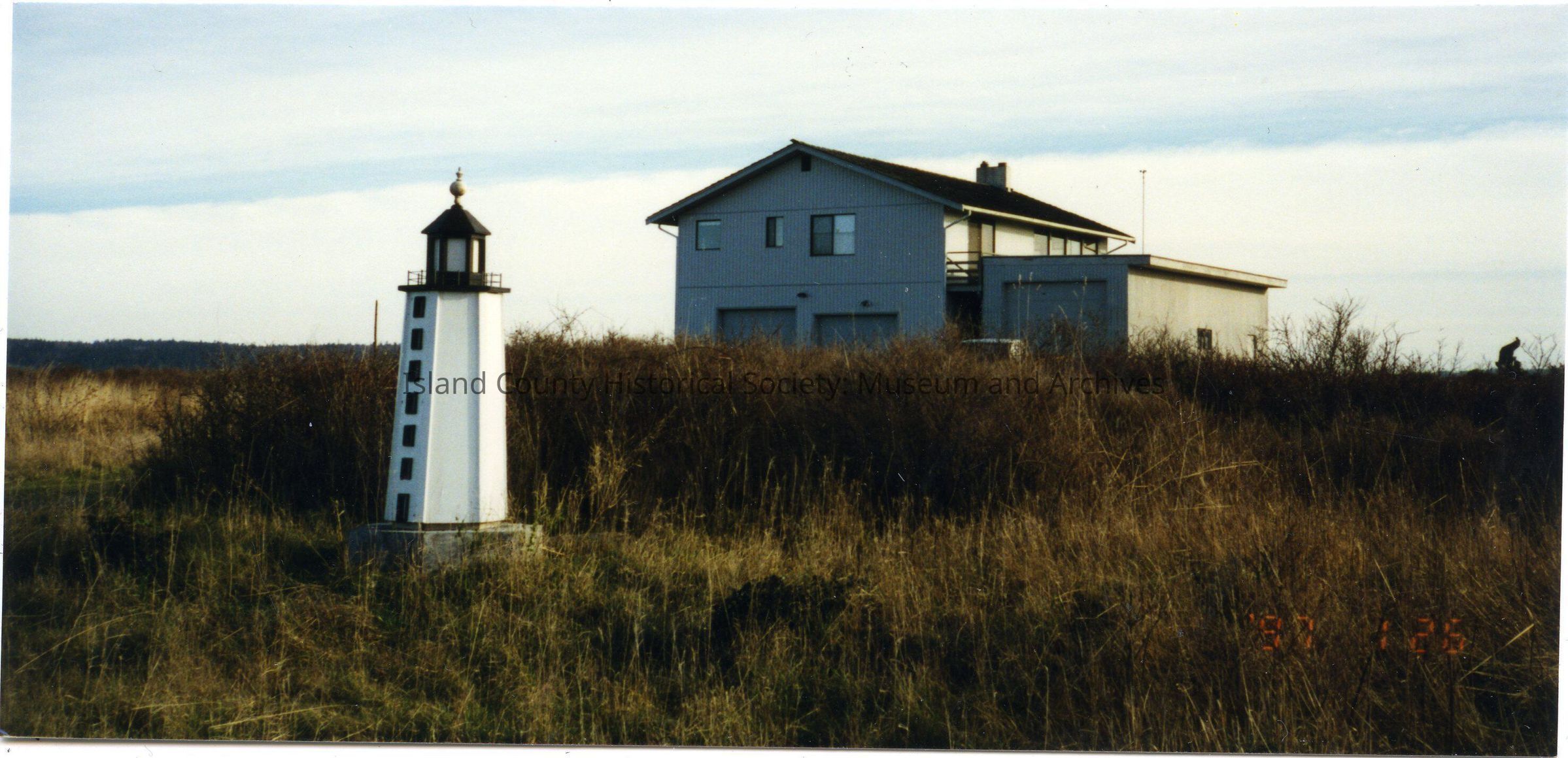Photo of a two story modern house with chimney, two car garage on lower level, outbuilding/RV shed with a car in front (only see part of the roof). A lighthouse replica/garden decoration is in the foreground. There are no trees, just grasses. On the back: Old Madam's House, Keystone Spit. (Not sure if the handwriting - Madam?/Hadam?)