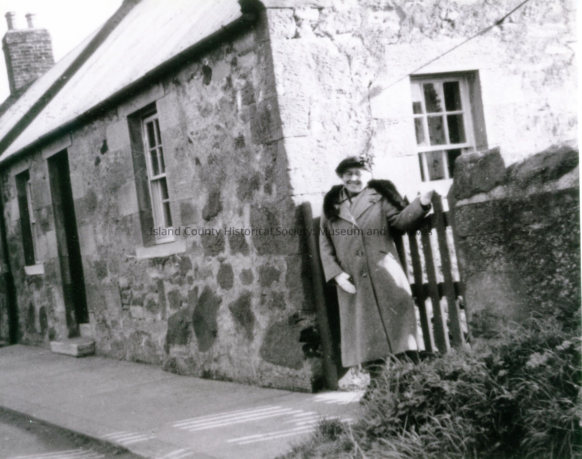Black and white photograph of a lady dressed for cold weather, standing in front of a gate on a sidewalk with a stone house next to her.