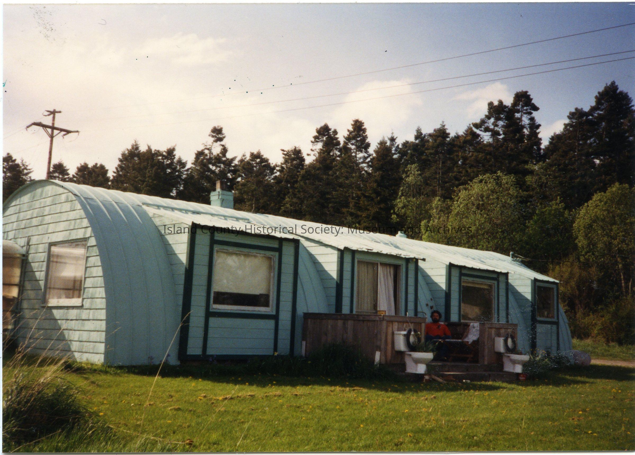 Photo of a quonset jut house - green. A telephone pole is behind it. Two toilets with the seats and lids raised are on either side of the porch. A bearded man in a red shirt is sitting on the porch. There is a chimney in the back. A piece of paper with the photo: Quonset Hut House, Date built: c1945, Address: 932 Ft. Casey Rd. - moved here in 1945-6. Turn left from Wanamaker Road onto Ft. Casey Road. Quonset hut will be right in front of you.