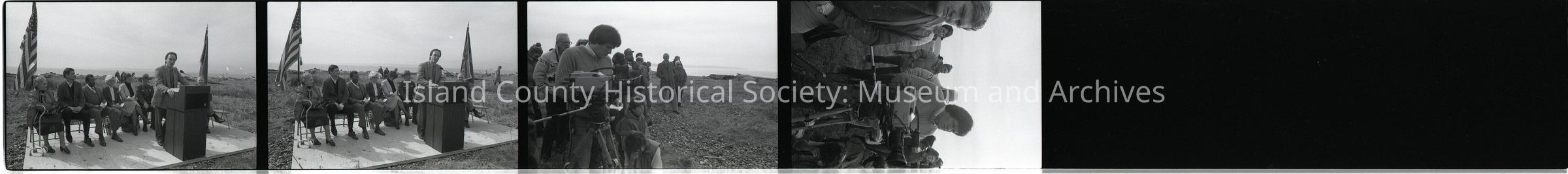 Negative strip with four images (two frames are empty) showing a group of people at a dedication ceremony. In two frames a man is speaking at a podium with men and women seated behind him and the U.S. flag on his right and another flag on his left. The other trow frames show people standing around and a photographer with camera in foreground.