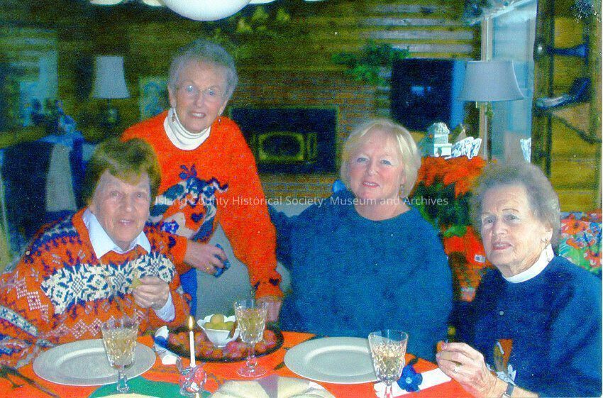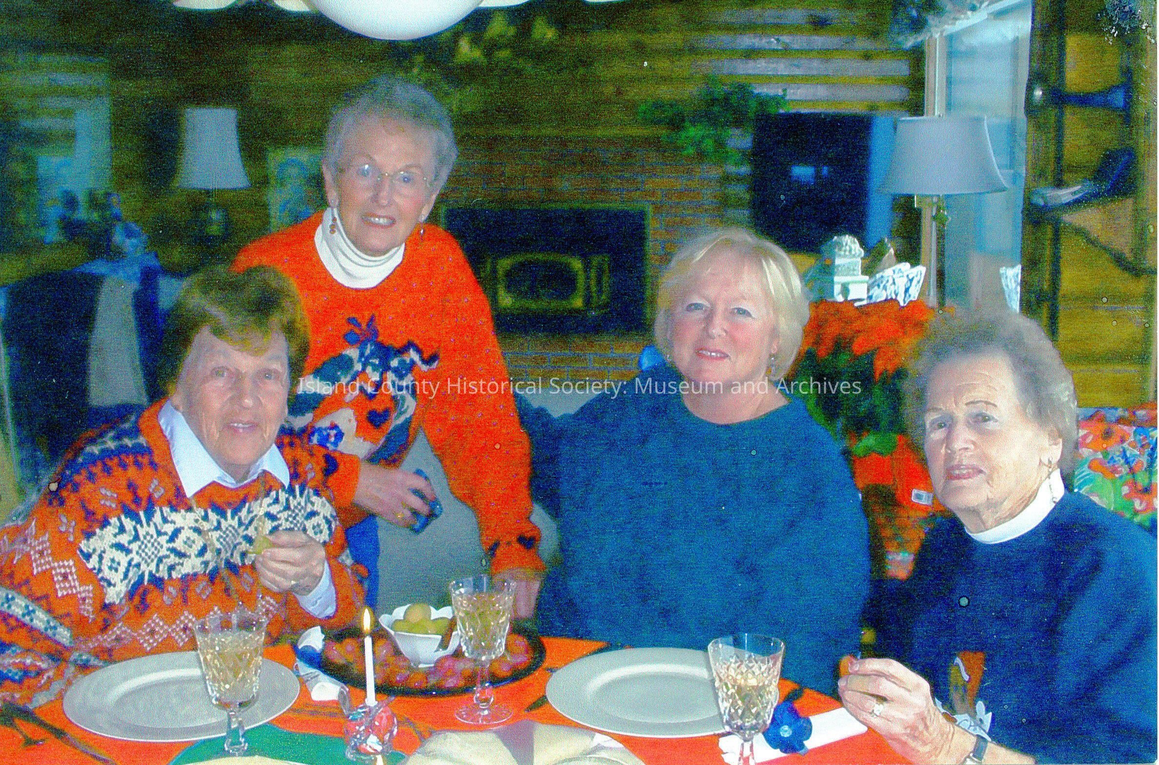 Color photograph of four women inside what appears to be a house, sitting around a dining table set for a meal. Three are seated, and one is standing. They all are wearing christmas sweaters. Ginger Bell Erickson on the left, Bonnie Bell Miller, Bonnie's daughter Jennifer Johnston, and Winnie Bell McLeod on the right. Taken in Bonnie's home on Bells Beach. Circa 2005.