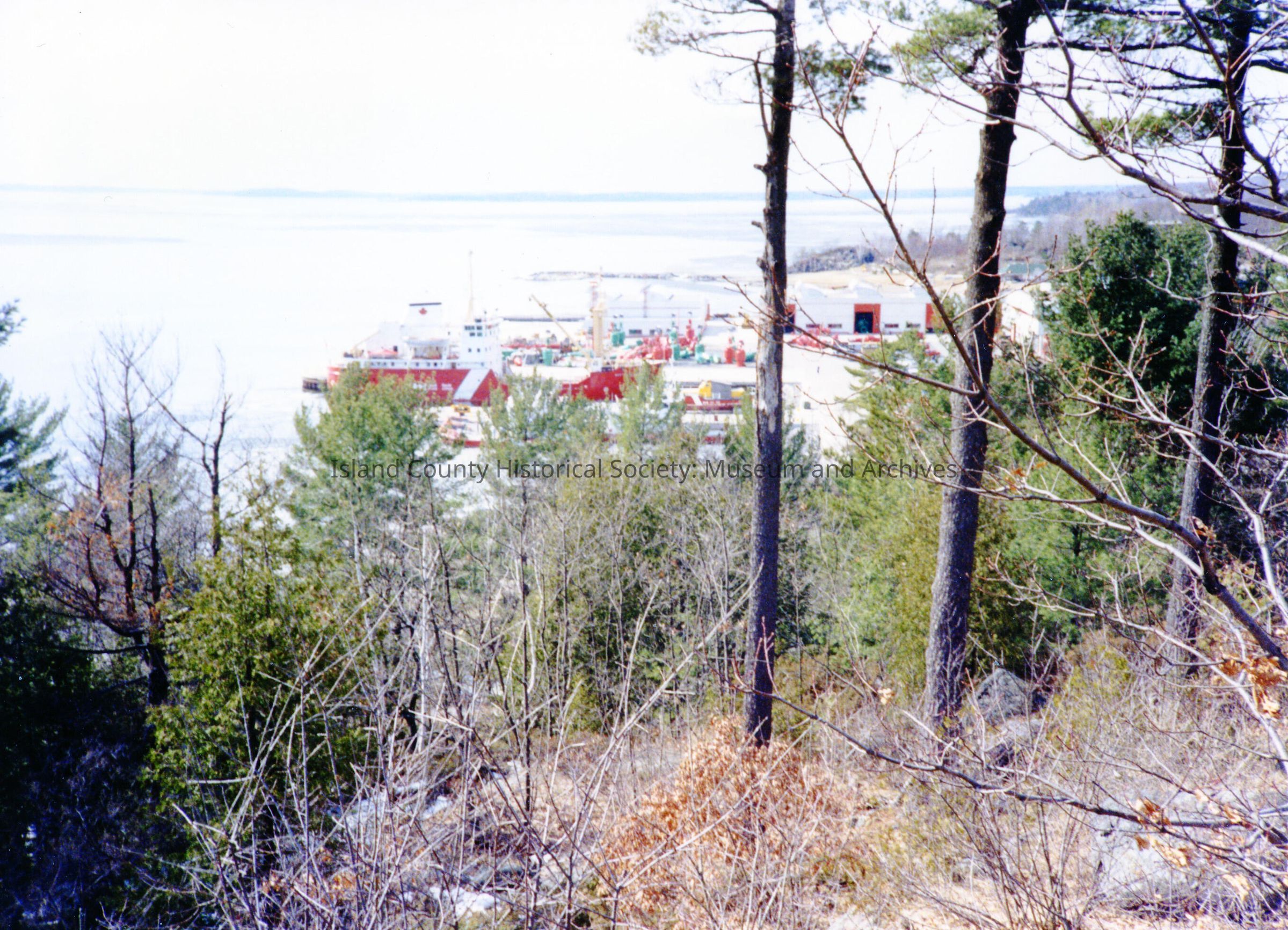 Color photograph taken from a hill side looking towards the water with trees in the foreground. Located in the picture is a red and white ship with a red cross on its stack. To the right of the ship is a white building with several overhead doors located in it. There are many red objects located on the land near the building.