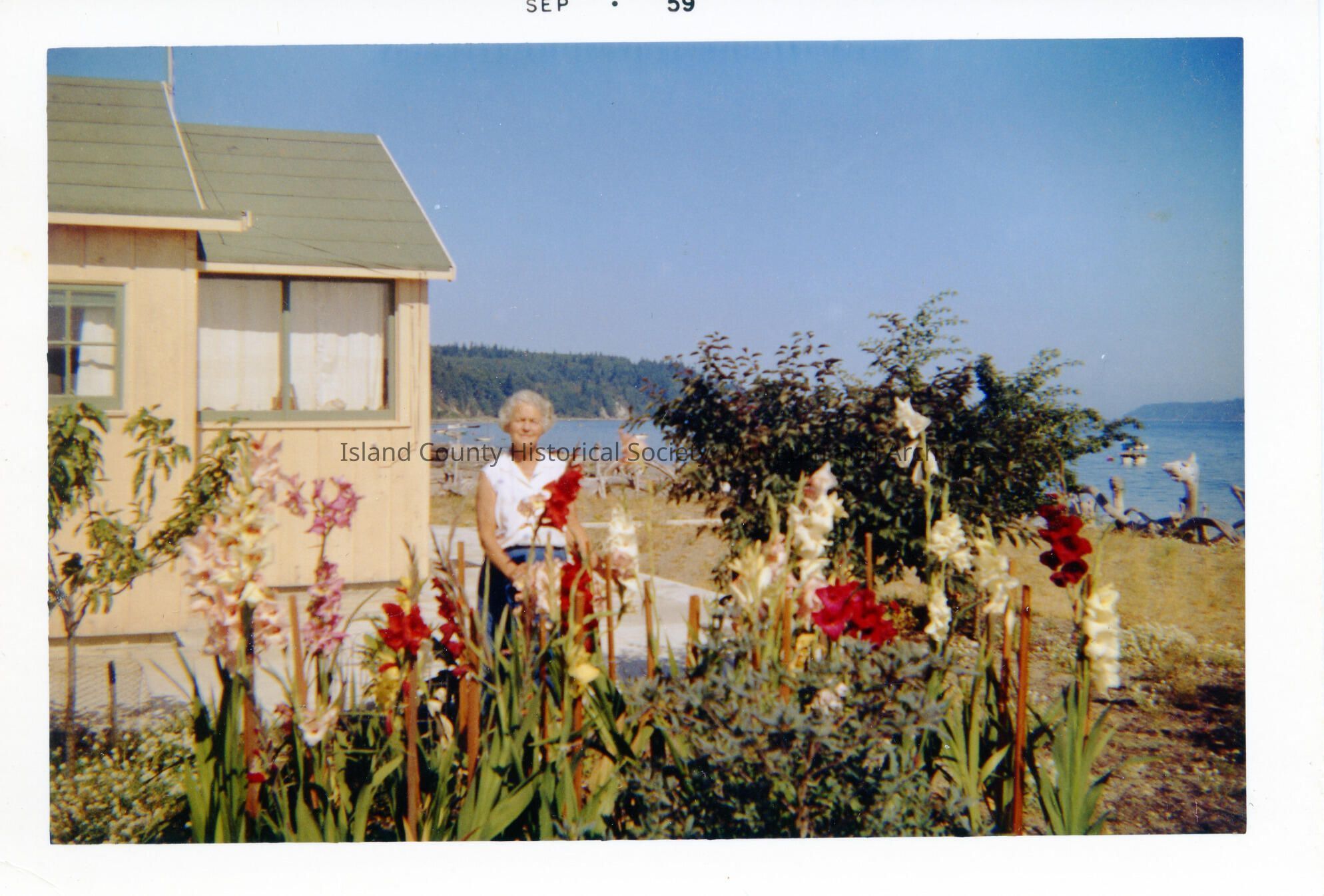Color photograph of an older woman standing behind some flowers in front of a beige house with a green roof and trim. In the background can be seen water and land. Grandma Elizabeth Bell in her garden at her home on Bells Beach. They bought the land in the 1920s.