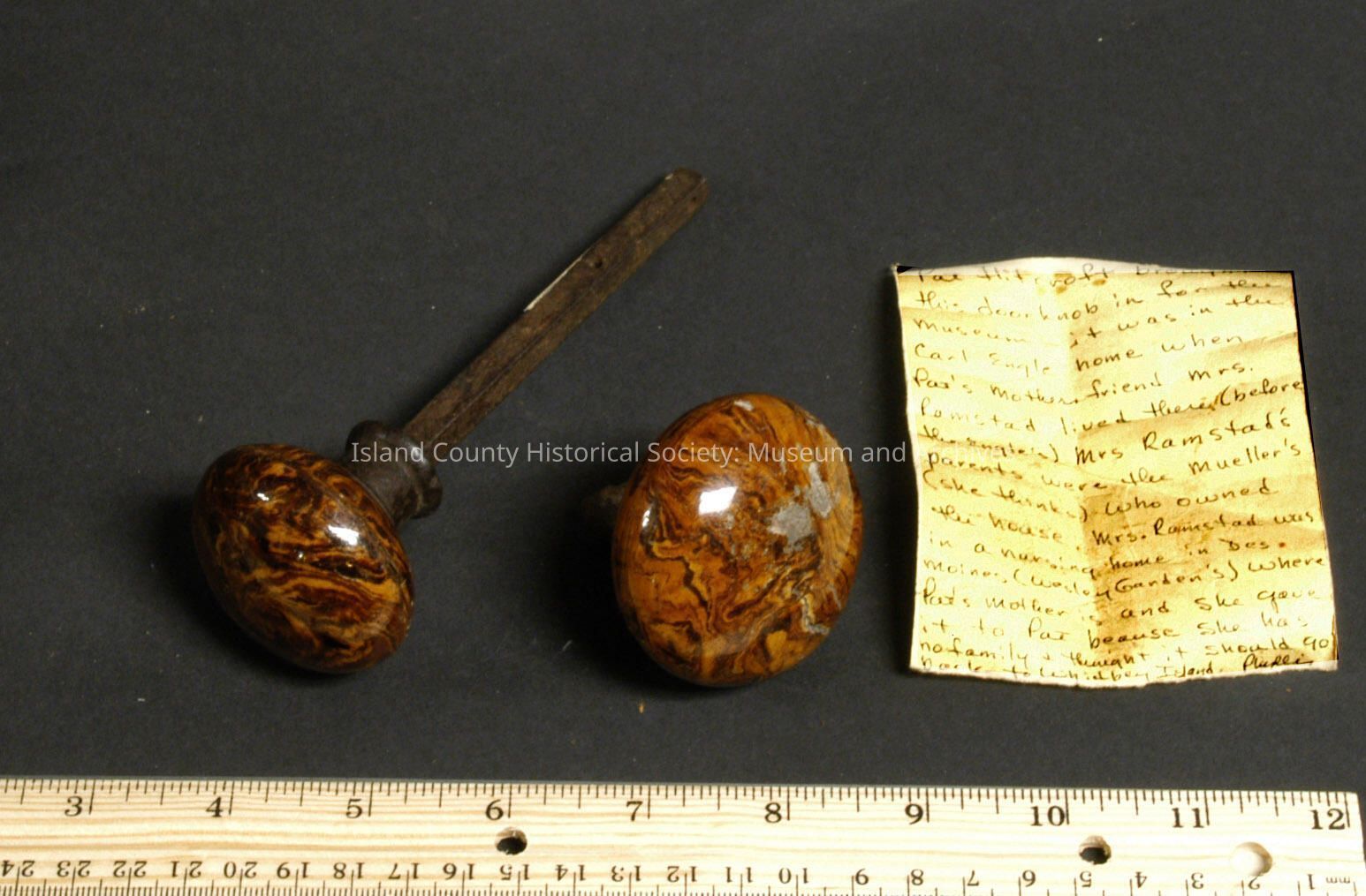 door knobs (2) and a note. marbleized glass. From Carl Engle home, when Mrs. Ramstad lived there (before Engles). Mrs. Ramstad's parents were the Muelliers, who owned the house.