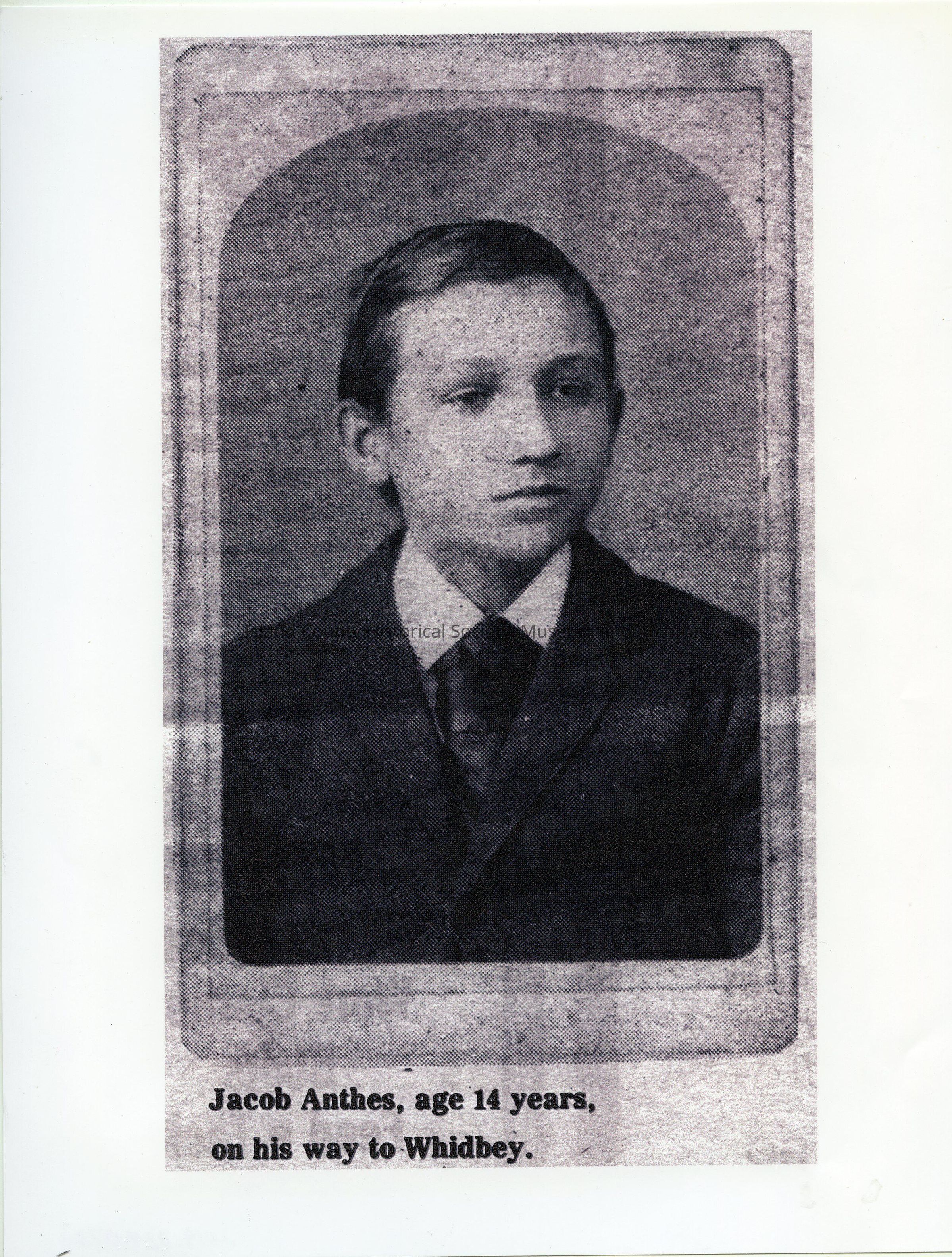 Caption typed on the bottom of a copy of the original photo: Jacob Anthes, age 14 years, on his way to Whidbey.
