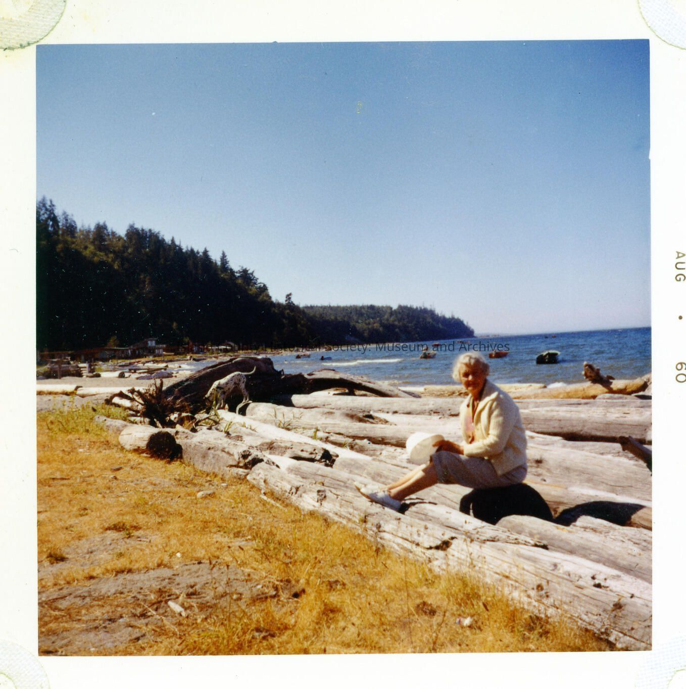 Color photograph of an older woman sitting on weathered logs on a beach. One can see a cove, water, and bluff in background. The date "Aug 60" appears on right edge of print. Grandma Elizabeth Bell on the beach. She was 83 when she died in 1971.