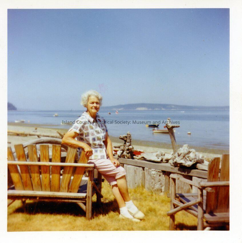 Color photograph of an older woman sitting on the arm of a wooden bench. The woman appears to be the same person as seen in 2017.027.039. There is water in the background, boats, and land on either side of an area that appears to be an opening in the land to more water beyond. Grandma Elizabeth Bell at her home on Bells Beach. Her outfit in the photo is typical for her.