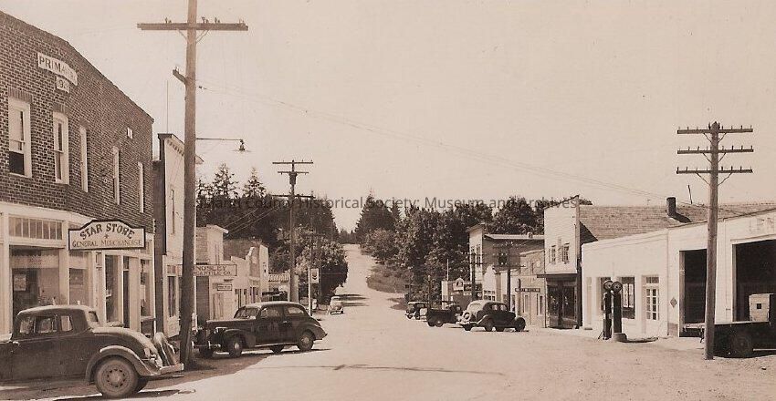 Downtown Langley, 1940. Several old cars are parked on the street.Made/Created