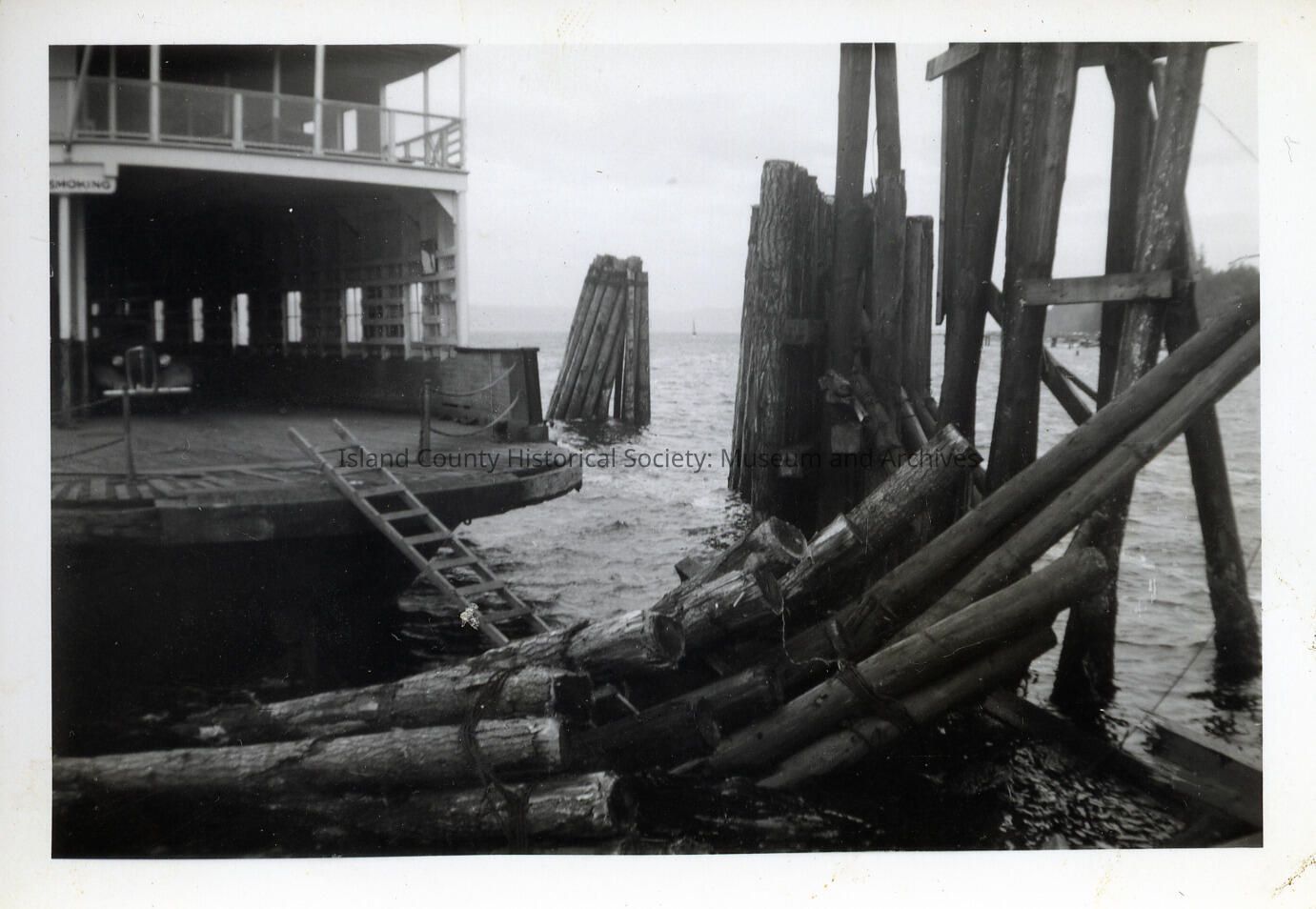 Black and white photograph of an old automobile ferry with front of one car showing. There is a wooden ladder from ferry to land spanning shallow water. Several pillonds appear to have been knocked down, and others are still up-right.