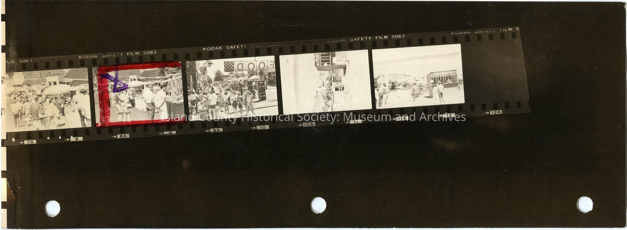 Contact sheet of 5 frames of groups of people at a street show or festival. Written on the back: Choochokam. Choochokam was a music and arts festival in Langley that started in 1975 and was held the second week in July. From the folder: Langley Town