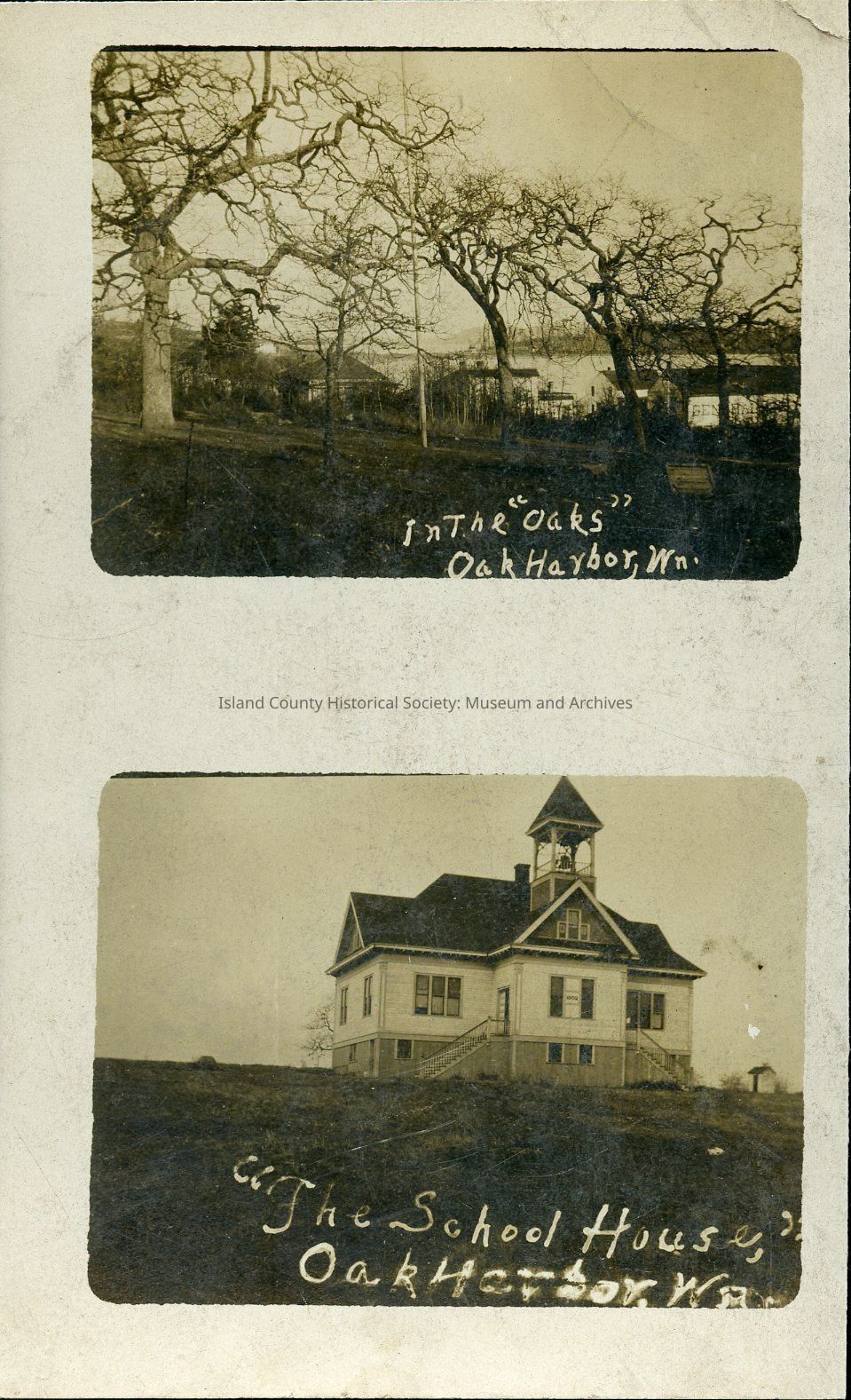 Postcard depicting Smith Park in Oak Harbor (top picture) Oak Harbor schoolhouse, which was later used as "City Hall" (bottom picture). The schoolhouse was located where the present day city hall is located. It had an aircraft observing tower added in World War II, and the building itself was moved to West Oak Harbor. It is currently used as a church but has been modified beyond recognition. Photos c. 1911.