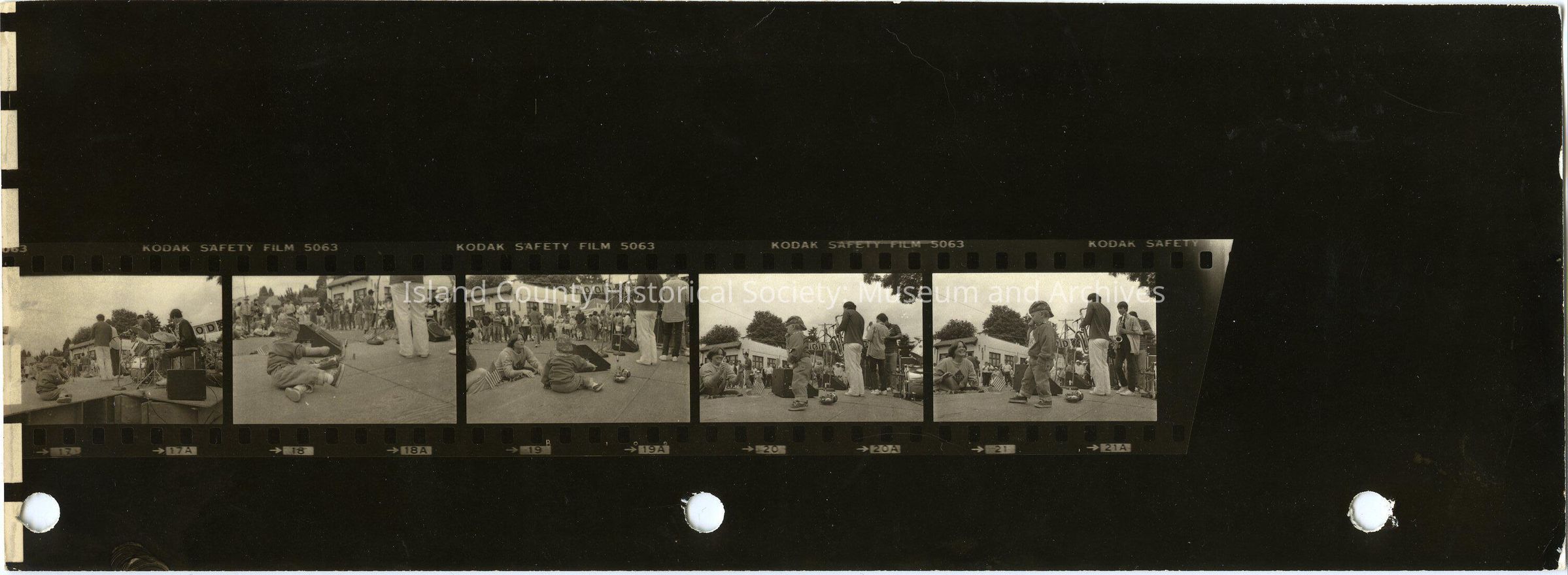 Contact sheet of 5 frames of groups of people at a street show or festival. Written on the back: Choochokam. Choochokam was a music and arts festival in Langley that started in 1975 and was held the second week in July. From the folder: Langley Town