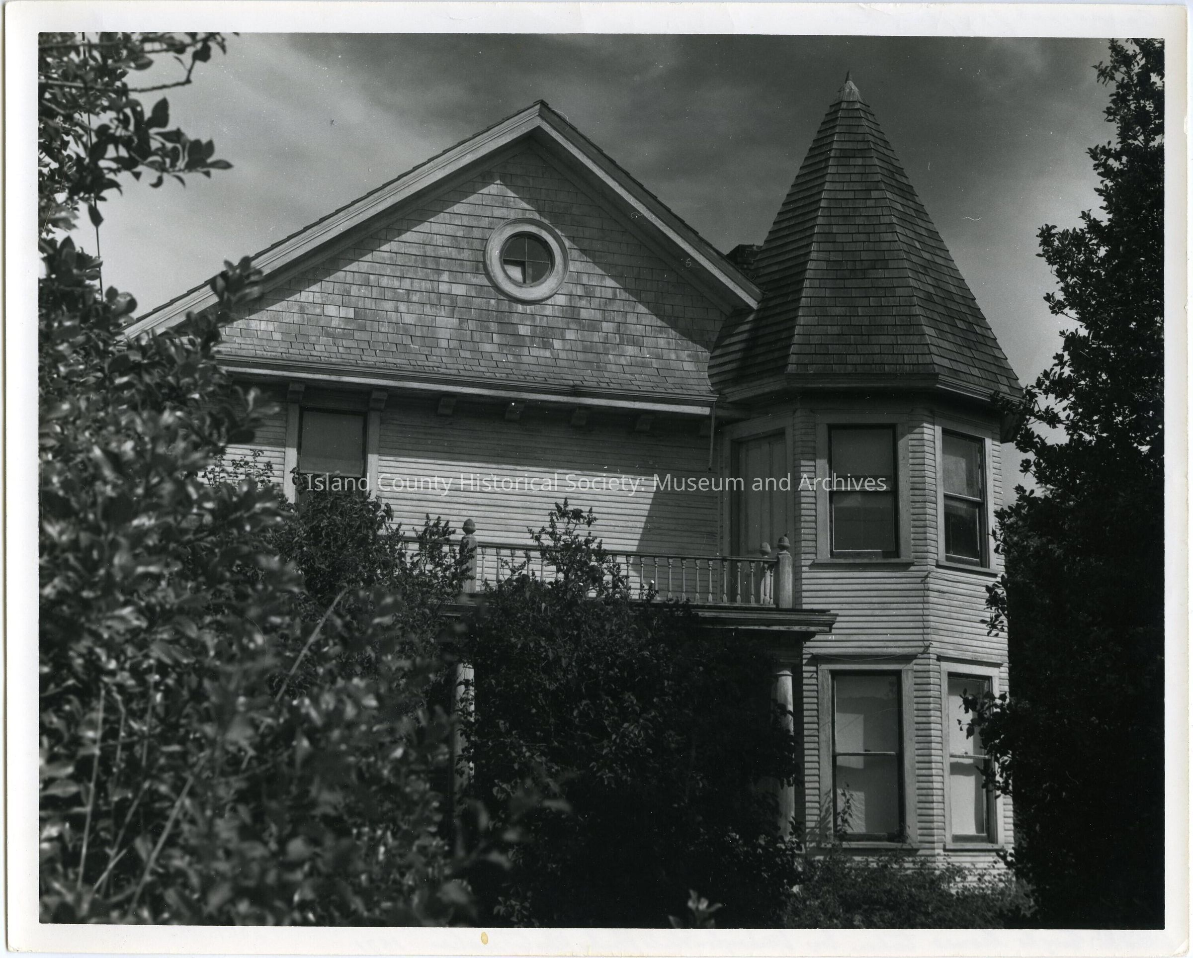 Photo of a two-story house with a turret on the right, round window at the roof peak, covered porch with a railing on the flat porch roof. Roof is cedar shingles. Trees and bushes obscure the rest of the house. On the back: Hill Harmon/Ralph Engle house; Ralph Engle house taken by Washington State Parks Photographer, 1971. Coupeville/72/Aug/R.L. Engle Home - 1858.