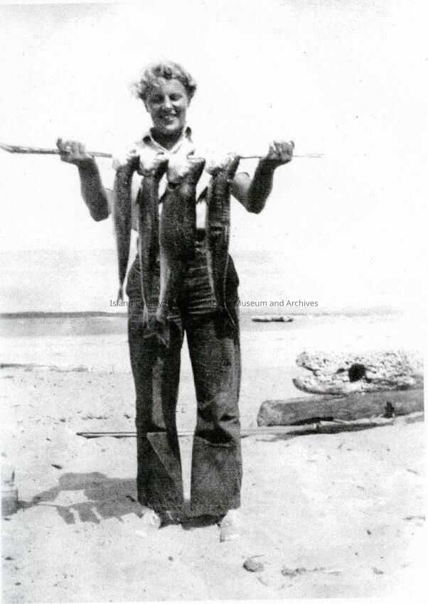 Black and white photograph of a woman holding a stick with four fishes on it. The photograph was taken on a beach with water in the background. Ruth Bell Jacobson with her catch on Bells Beach.
