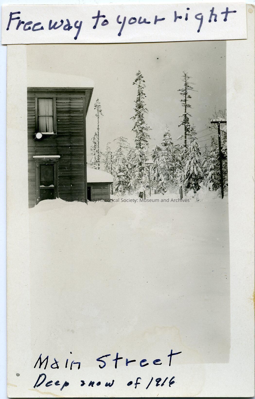 Postcard of the side of a two-story building with trees in the background and a shed on the side. A telephone pole is on the right. Snow. Writing on the top and bottom: Freeway to your right. Main Street. Deep snow of 1916. Written on the back: Langley.