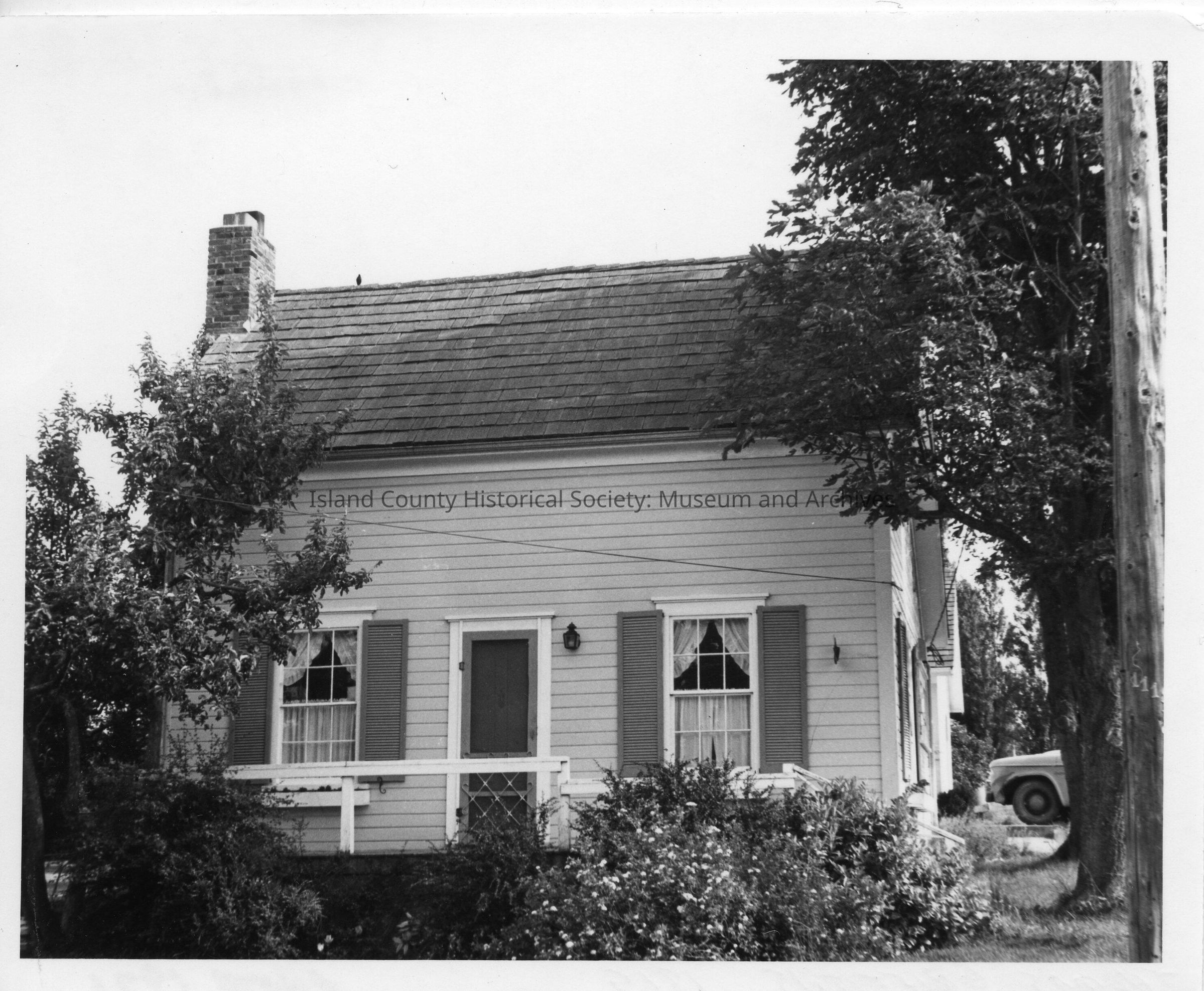 Black & white photo of the front of the Thomas Griffith's house in Coupeville - built in 1869. The house is located at 101 Northeast 9th Street. The photo shows two single windows with shutters, one window on each side of the front door. Photo taken 1971. For additional information see PNRO Bluebook page 178.