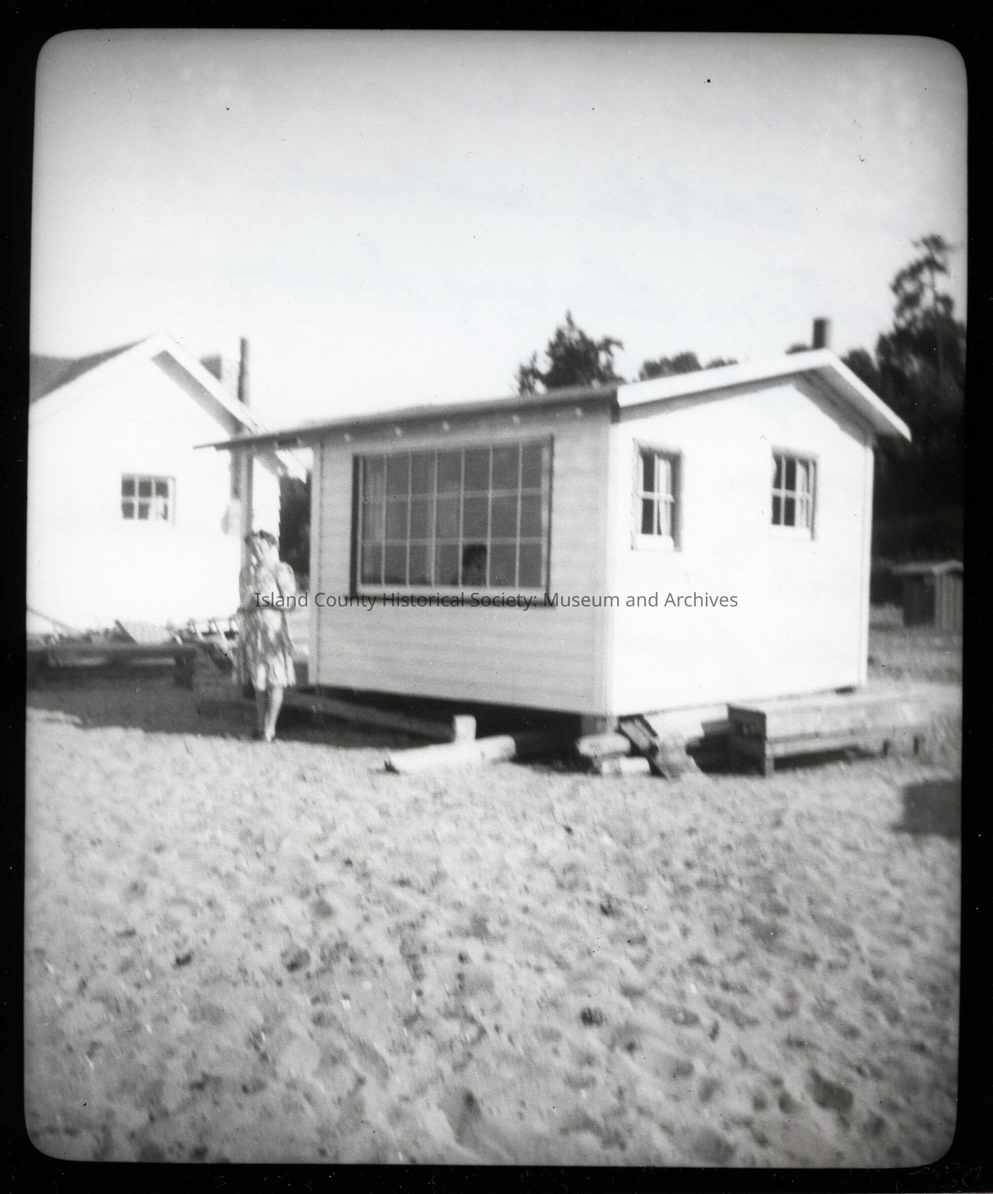Black and white photograph of a woman in a dress standing in front of a house on the beach. The house is white and there is a view of another house partially seen in the background. Ruth and Norm Jacobson's fishing cabin on Bells Beach.