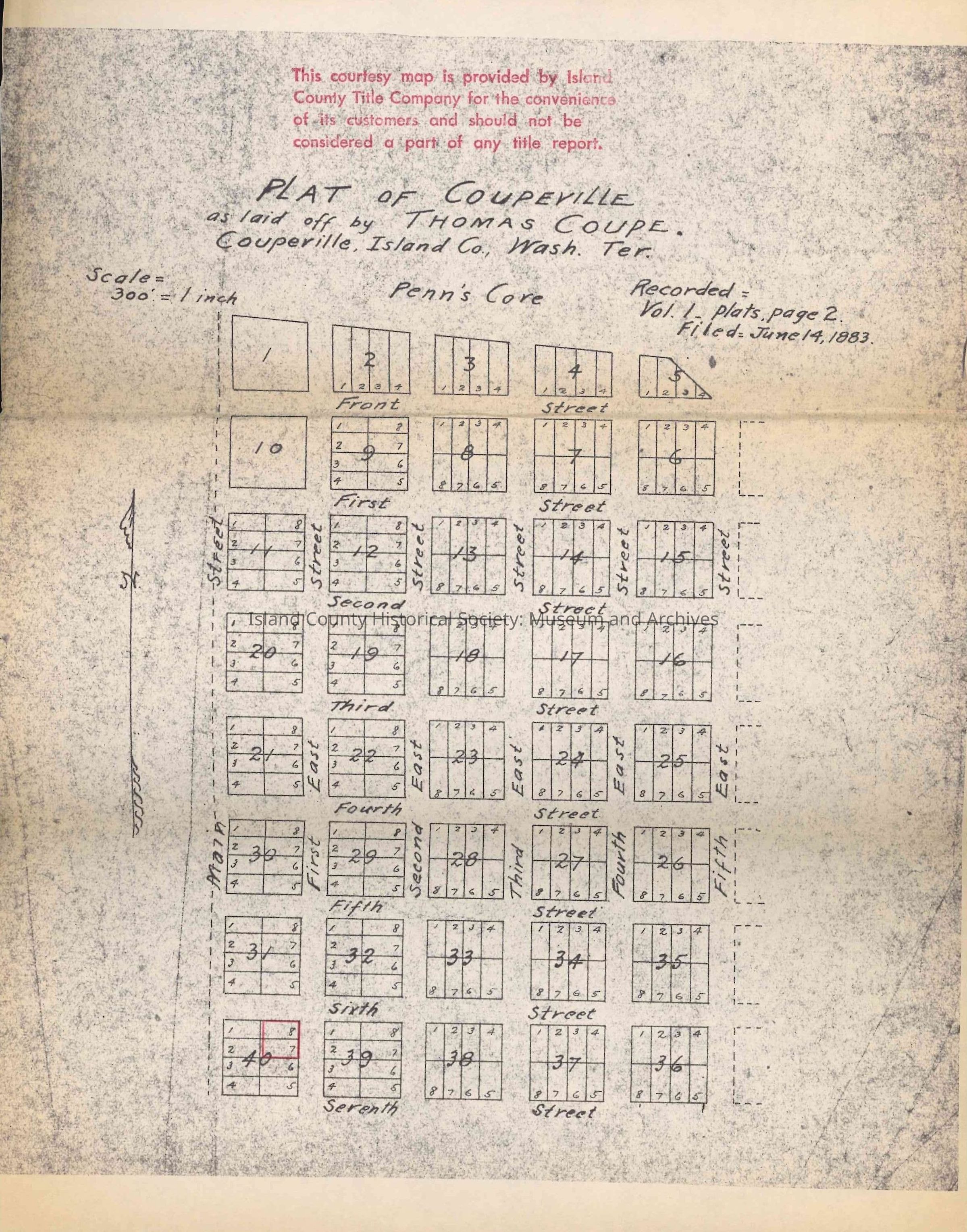 Map provided by Island County Title Company denoting real estate purchased by Frank and Dorothy Dickey from Melvin J. Grimm and Ruth Ann Grimm -- Lots 7 and 8 in block 40, as denoted by the red square on the map.Collection