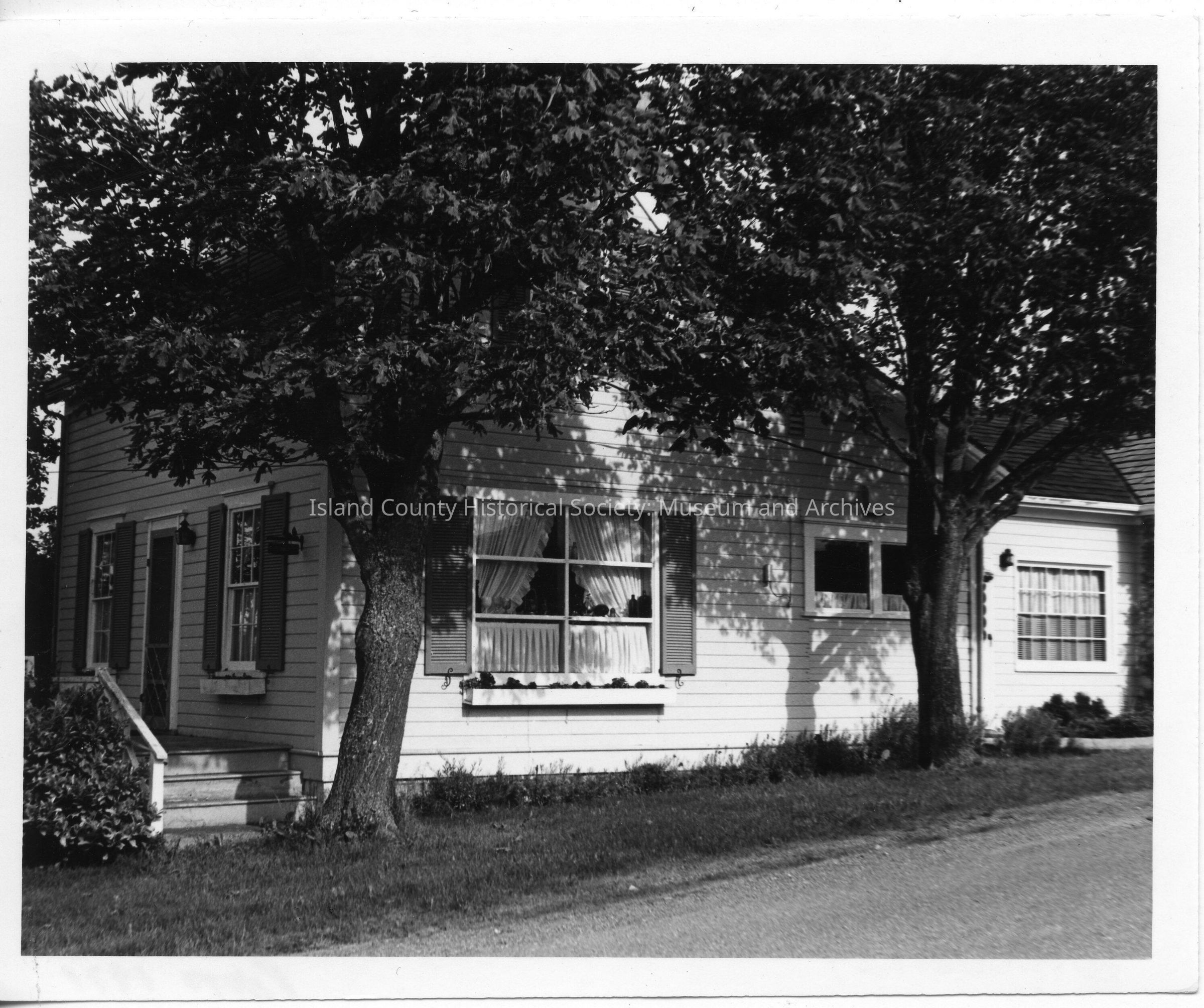 Black & white photo of the right side of the Thomas Griffith's house in Coupeville - built in 1869. The house is located at 101 Northeast 9th Street. The photo shows the double window on the right side of the house. There is a tree on each corner. Photo taken in 1971. For additional informtion see PNRO Bluebook page 178.