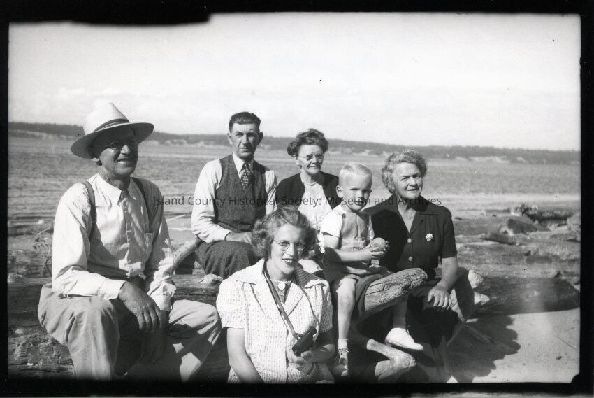 Black and white photograph consisting of two men, a young boy, and three women. The people are on a beach with drift logs visible. Water is seen in the background. Grandpa Dave Bell, unidentified man in the back, then Josie Jacobson in the back. In the front on the left is Ruth Bell Jacobson, Gary Jacobson, Grandma Elizabeth Bell on Bells Beach.